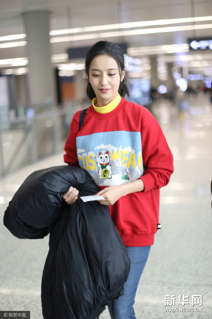 佟丽娅机头梳半丸子头,身穿GCDS 2017秋冬系列招财猫雪山风景印花红黄拼色高领卫衣,下身穿磨边紧身牛仔铅笔裤,脚踩GGDB五角星小白鞋,手拿黑色羽绒服,肩背黑色单肩包。