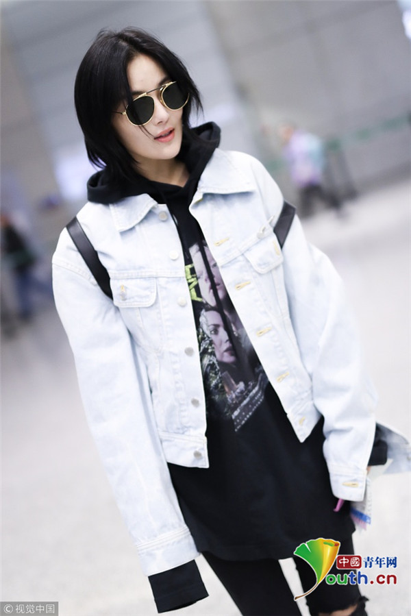 2017年12月13日,上海,张馨予现身机场,穿连帽衣显清爽,剪短发架黑超形似王菲,歪头撩发又帅又酷。