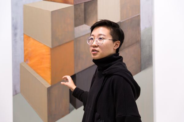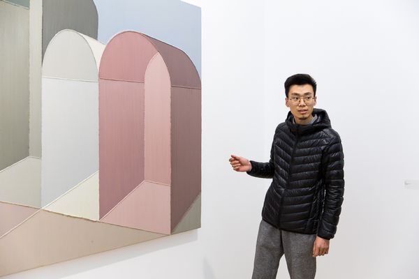 艺术家赵新宇,1989年出生于内蒙古,2012年毕业于四川美术学院油画系。赵新宇最早的创作,即为人所知的“车厢”系列,涉及了一种日常经验,后续阶段的作品以情绪性和叙事性为底色,而使得整个画面颇具戏剧色彩。在新作当中,这一痕迹的延伸则是赵新宇似乎试图通过对画面结构的编排,对比之前的作品,依旧是在构景,但却在逐渐在取缔物的现实性因素。新作当中技法的转变,厚涂式的平推仅保留了一部分,新作当中的转向在某种程度上仅仅构成了对于厚涂画法的一个对立面发生,像是一次新的开场,画面本体基本问题再次喷涌而来,在这一情形下,赵新宇通过对于框架结构式描绘的转向,试图引向一种对于画面心理的感知。