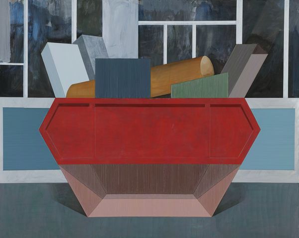 赵新宇作品当中的图式来源,无论是从摄影作品中或者装置作品中抑或现实当中选取某个场景的边角,从某种程度上,均服从于他个人基于谨慎的、甚至敏感的内在压制,正如《室外2#容器》背景的窗框,称其为窗框,倒不如把它当作画面整体结构的一个同级逻辑走向,正如同置放在背景前的所谓“容器”当中的几何体,是几何化了的现实物与根据画面再行部分添加的合奏,在某种程度上,也可以说是塞尚绘画理念的一则变异体。
