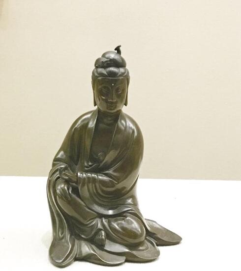 其中,最引人注目的莫过于展览海报上呈现的“景德镇白釉瓷塑观音菩萨像”,产于南宋时期,整尊瓷塑构思既简约又精巧,以粗线条捏塑形体与衣纹,胸前璎珞精致,人物形象传神,充分展现了宋代瓷塑艺术的审美意韵与高超技艺。令人啧啧称赞的还有明中晚期的“铜观音菩萨像”。此像采用暹罗国(今泰国)所贡优质风磨铜铸造,工艺精细,抚之如婴儿肌肤,嵌银丝,背后银丝镶嵌方章铭款“石叟”二字,当出自石叟本人之手。据了解,石叟为明代晚期铸铜塑像名匠,僧人身份,现存中晚明观音铜像中尚有部分“石叟”款,真品珍贵稀罕。