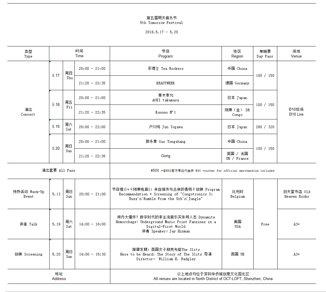 深圳新闻网讯 五月既至,好事即将发生。由深圳华侨城创意文化园主办的第五届明天音乐节将于2018年5月17日至20日在B10现场举行。本届明天音乐节作为“有形无界”华侨城创意文化园文博会分会场系列活动的重点项目,将邀请来自6个国家的7组音乐家/艺术家,呈现包括演出、讲座、纪录片放映在内的多元节目。除此之外,策展人将于5月13日在旧天堂书店做节前预热,届时会有节目介绍环节和一场完整的放映活动。