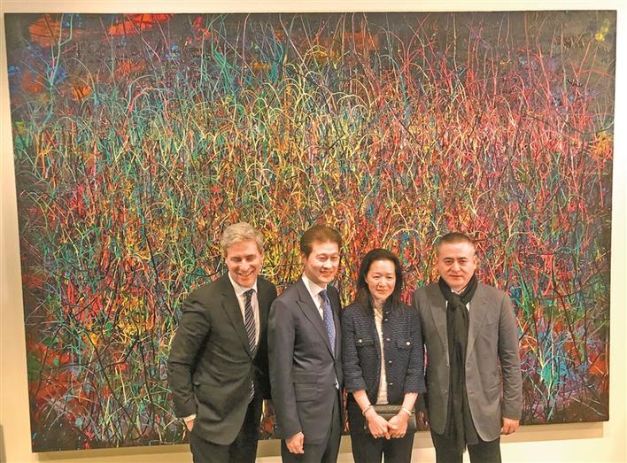 图为吴建民(左二)、曾梵志(右一)等在画作前合影。 (张朔 摄)
