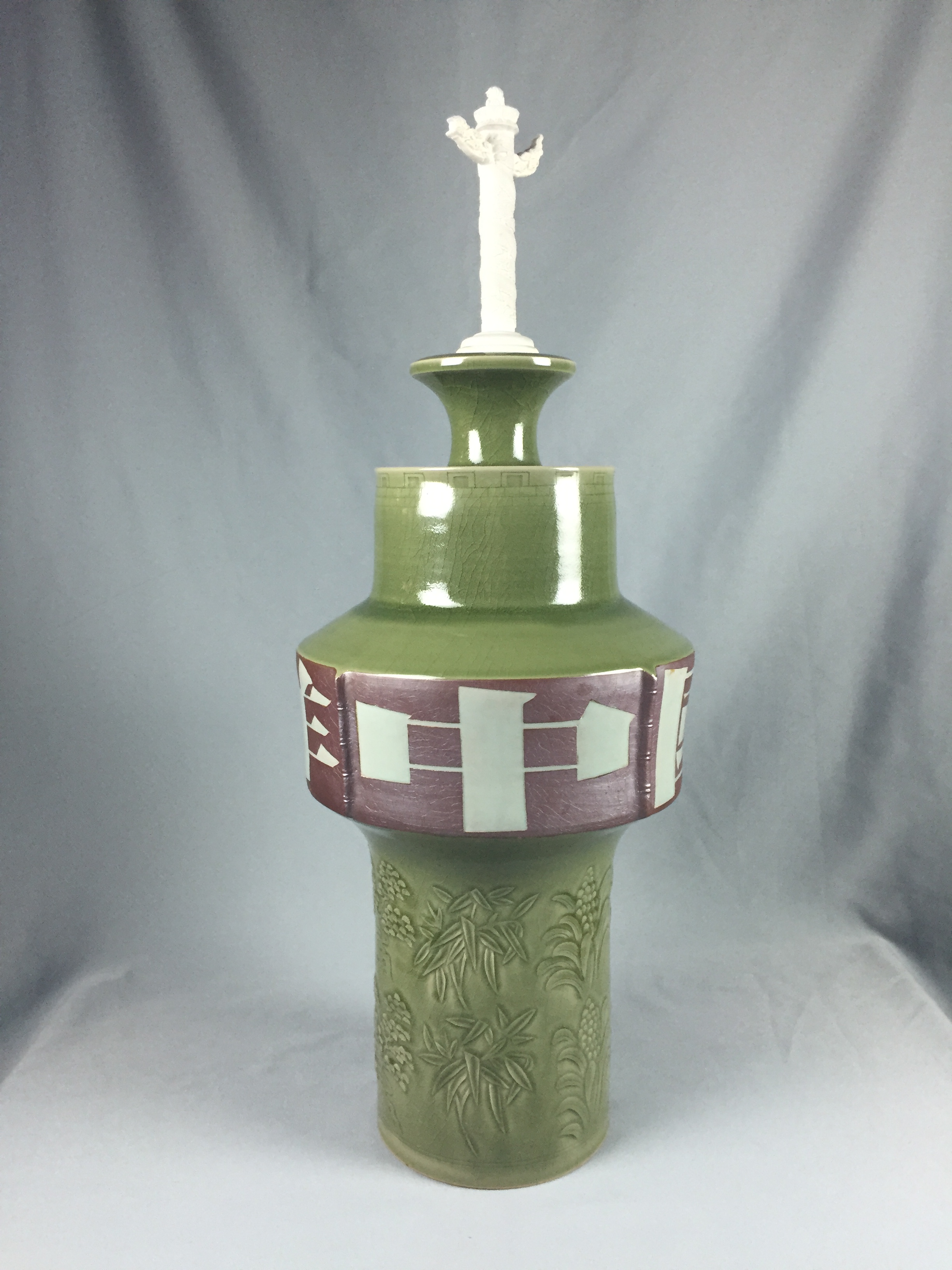 此次参与展出的青瓷作品中,一件名为“红底玉缕耀瓷刻花松竹万年青纹中国吉祥”的青瓷作品人气颇高。据介绍,此件作品由中国工艺美术大师孟树锋亲自制作。作品整体呈现“中”字造型,伟岸挺拔,雄浑方正,险峻奇特而大气磅礴。瓶顶一尊华表,白泥素胎,一如汉白玉石雕。瓶肩梢高凸又微微外撇,是一圈五十六个垛峰与垛口的万里长城,代表着中国五十六个民族团结一心。其下硕腹,则使用耀州红底玉缕的工艺书写“中国吉祥”四个雕版大字,点明作品主题。下部立柱上刻、划、贴花的万年青、青松、竹子,体现耀州瓷的风格并以此祝福祖国。