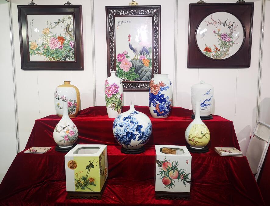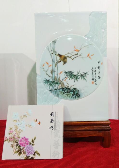 江西省陶瓷技能大师、江西省高级工艺美术师、恽派花鸟第十二代传人、景德镇青年陶瓷艺术家刘嘉鸿此次展会展出的陶瓷艺术作品共计35件,包含瓷板画、瓷瓶、瓷盘、青花瓷、青花斗彩瓷等,其中《春满园》、《锦堂富贵》、《长寿图》等作品呈现陶瓷技艺,展示出刘嘉鸿深厚的艺术造诣。