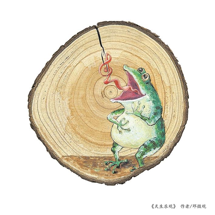 上榜漫画家邓微观系深圳市宝安区打铁文艺社社长,其《感物系列》以见物兴感为主线,展开丰富的想象力,用动物拟人的方式幽默诙谐地抒发人生感悟,让人会心一笑之余引起共鸣,令观众感叹艺术家的漫无边际的“脑洞”。对于作品首次入选国内美术界规格最高的国展,邓微观很兴奋:“这是对我这个系列作品的高度肯定。”《感物系列》系列作品源于他闲逛发呆时的想象碎片,将这个碎片贯穿就成了这个系列作品。邓微观在茶余饭后经常到铁岗的西乡河边散步,河中不时传来低频厚实的“男低音”引起他的注意,此起彼伏,听来如交响曲一般通达舒畅。他循声寻觅,原来是蛤蟆的声音,只见这些“音乐家”在下水道洞口,在草丛中,河道缝中快乐地欢唱……这些天生的乐观者给邓微观带来美妙的心情,所以创作了这幅《天生乐观》。再如《三餐之余》,有时饭后经常会在茶几前发发呆,思考人生不应该只是面包和苹果,还应有点别的……