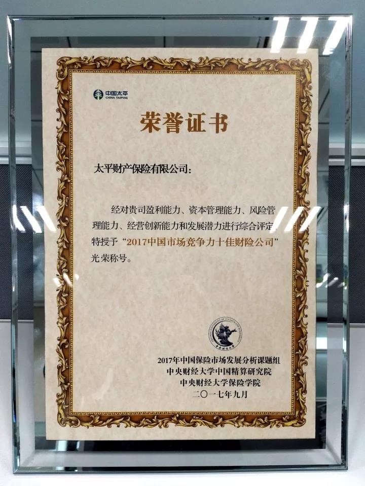 太平财险连续两年荣获“中国市场竞争力十佳保险公司”