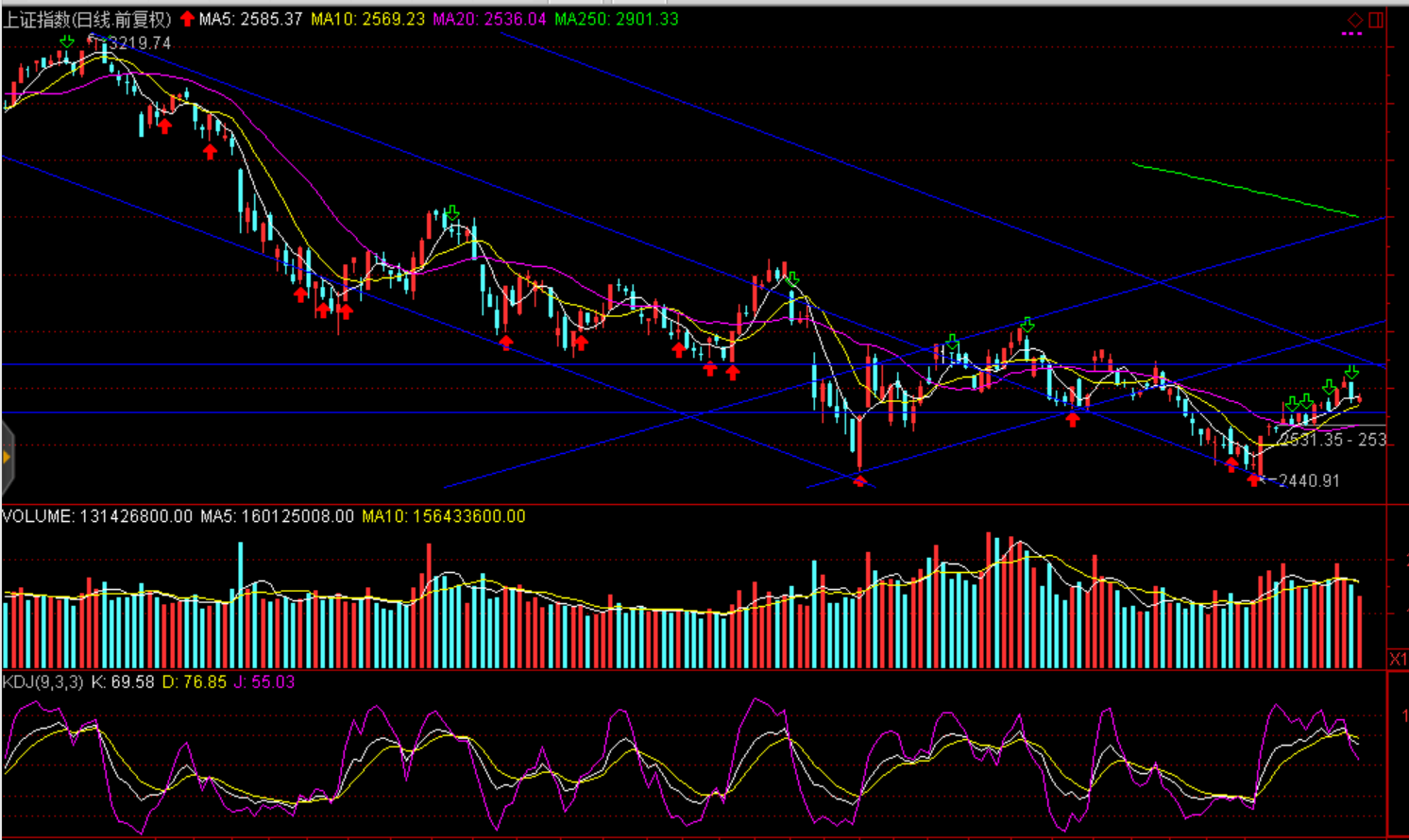 技术面:缩量整固,10日均线构筑短期多空平衡,成交量进一步萎缩至2000亿元左右形成窒息量结构则可视为调整结束迹象;沪指2500--2600点运行,今日支撑2574点、压力2591点。