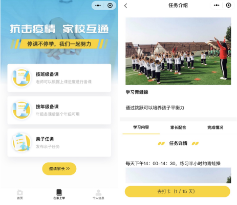 为此,“学子通”上线了“在家上学”功能,老师们可根据实际需要,选择“按班级备课”或“按年级备课”,针对班级或年级将录制好的备课内容,如防疫小知识、亲子阅读、亲子游戏等内容上传到“在家上学”模块,让孩子“宅”在家中也不停止学习的脚步。此外,老师还可通过设置亲子小任务,如一起做青蛙操、读读绘本小故事和亲子手工艺等,让家长和学生一起参与,并可设置打卡,调动起学生的学习兴趣,既增加亲子感情,又让学生开展室内锻炼活动、开展课外阅读,保持良好的身体状态,让宅在家中的假期生活变得丰富。