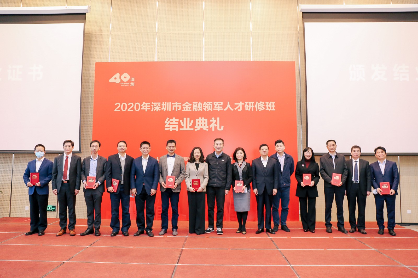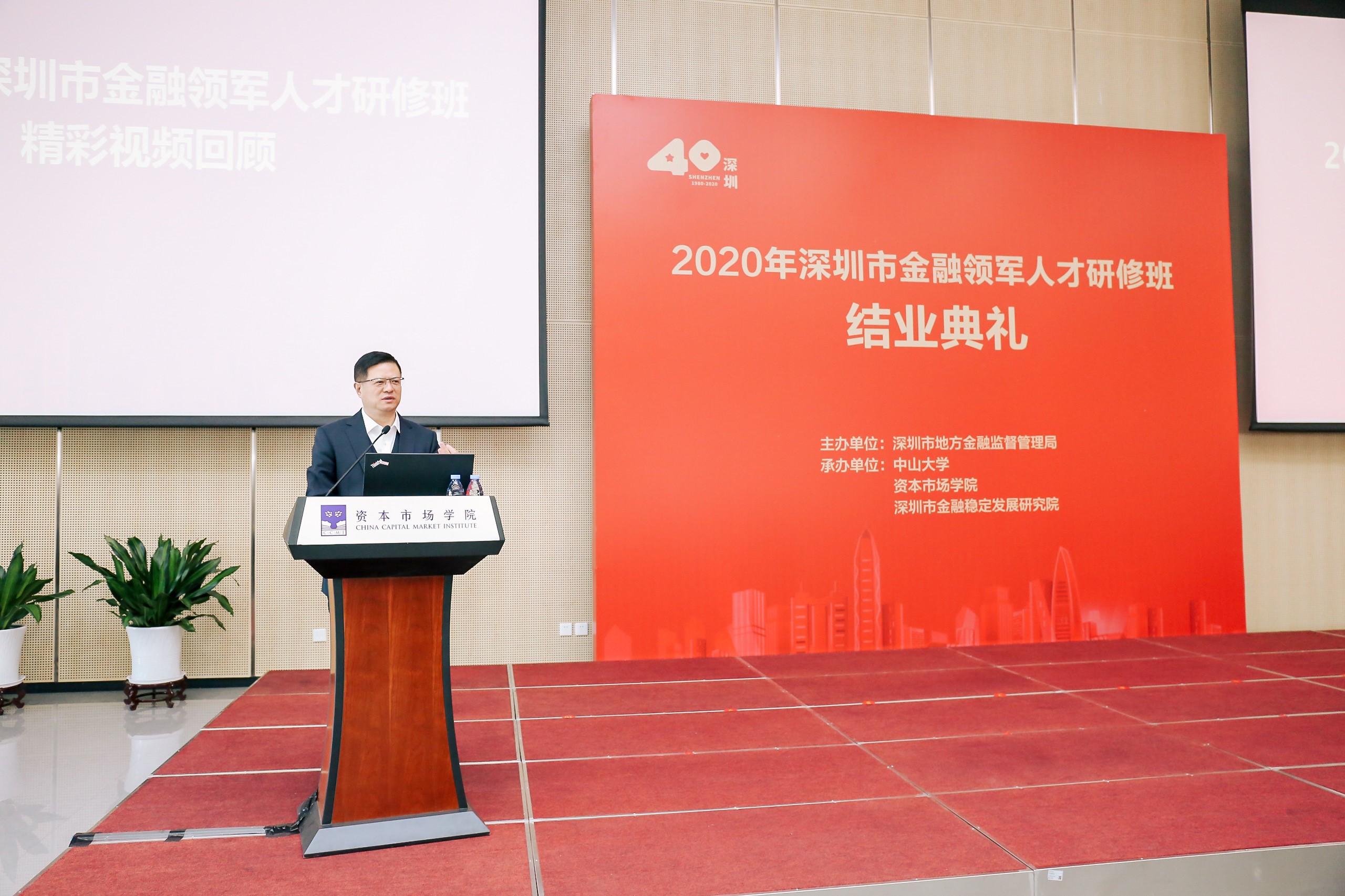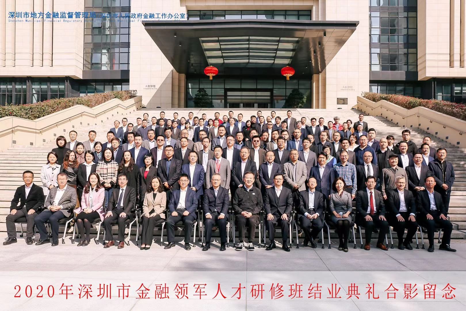 1月30日上午,2020年深圳金融领军人才研修班结业典礼在资本市场学院隆重举办。本期研修班由深圳市地方金融监督管理局主办,中山大学、资本市场学院、深圳市金融稳定发展研究院共同承办。市地方金融监管局党组书记刘平生主持结业典礼并致辞,局长何杰作总结讲话。资本市场学院副理事长、深圳市原副市长唐杰教授,资本市场学院党委书记陈自强、院长金立扬、副院长张韶辉,深圳银保监局副局长陈飞鸿、深圳证券交易所纪委书记邢力红,市地方金融监督管理局副巡视员林居正,中山大学岭南学院院长陆军教授,以及市委组织部、人民银行深圳市中心支行、深圳证监局有关领导应邀出席,本期研修班近110名学员参加活动。