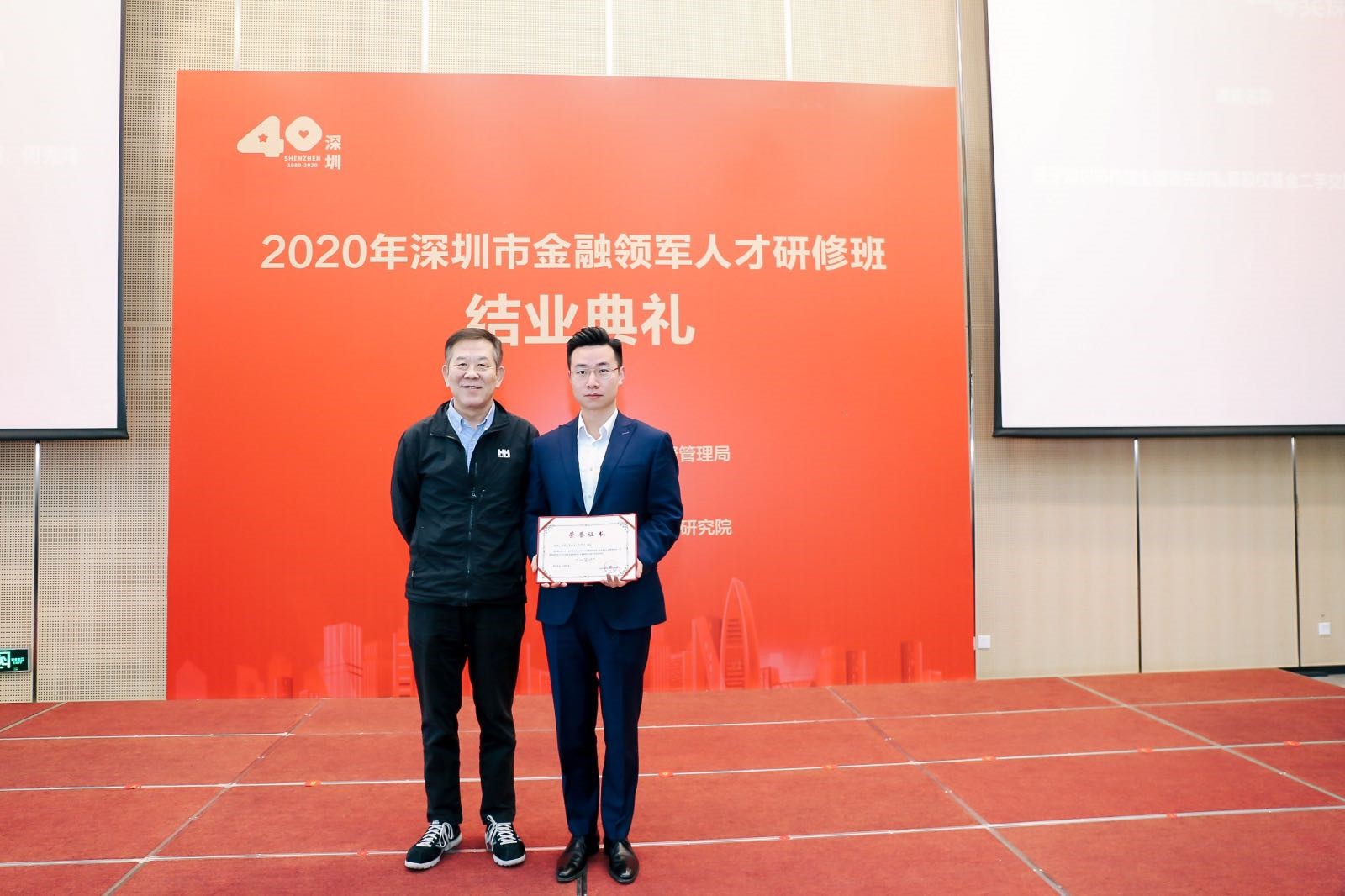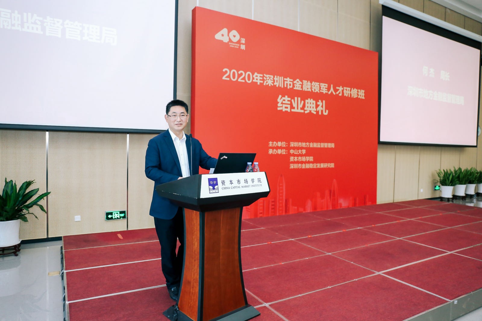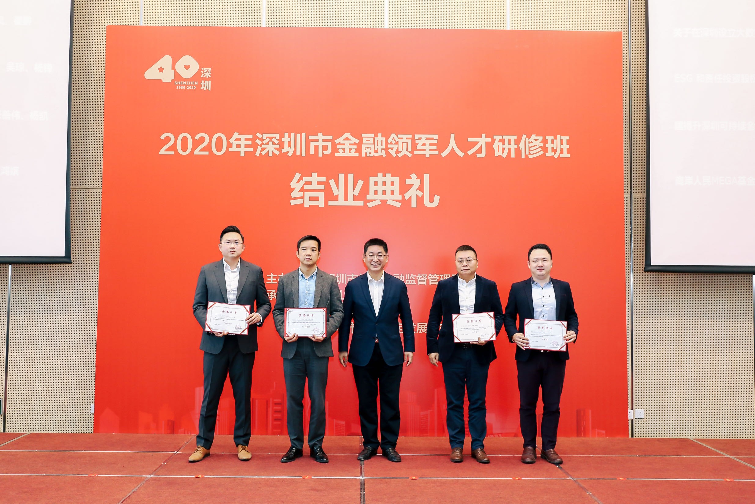 1月30日上午,2020年深圳金融领军人才研修班结业典礼在资本市场学院隆重举办。本期研修班由深圳市地方金融监督管理局主办,中山大学、资本市场学院、深圳市金融稳定发展研究院共同承办。市地方金融监管局党组书记刘平生主持结业典礼并致辞,局长何杰作总结讲话。资本市场学院副理事长、深圳市原副市长唐杰教授,资本市场学院党委书记陈自强、院长金立扬、副院长张韶辉,深圳银保监局副局长陈飞鸿、深圳证券交易所纪委书记邢力红,市地方金融监督管理局副巡视员林居正,中山大学岭南学院院长陆军教授,以及市委组织部、人民银行深圳市中心支行、深圳证监局有关领导应邀出席,本期研修班近110名学员参加活动。