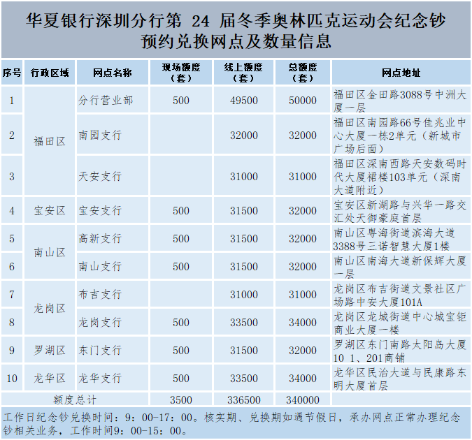 华夏银行深圳分行共10家网点承办冬奥纪念钞发行工作。为方便老年客户预约纪念钞,该行7家网点开放线下预约,市民可持有效的第二代居民身份证原件至公告的现场预约网点办理预约。纪念钞先到先得,额满为止。
