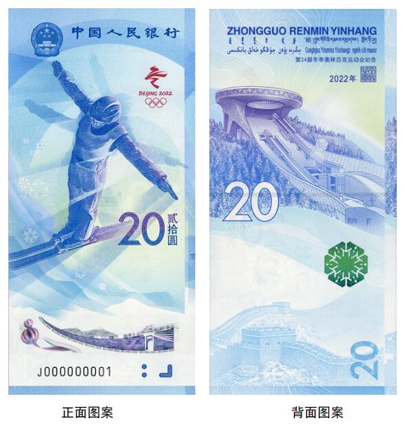 正面图案:正面主景为自由式滑雪运动员图案,上方为中华人民共和国国徽、“中国人民银行”行名,右侧为第24届冬季奥林匹克运动会会徽、面额数字“20”与汉字“贰拾圆”,下方为动感全息图案、盲文面额标记和冠字号码。