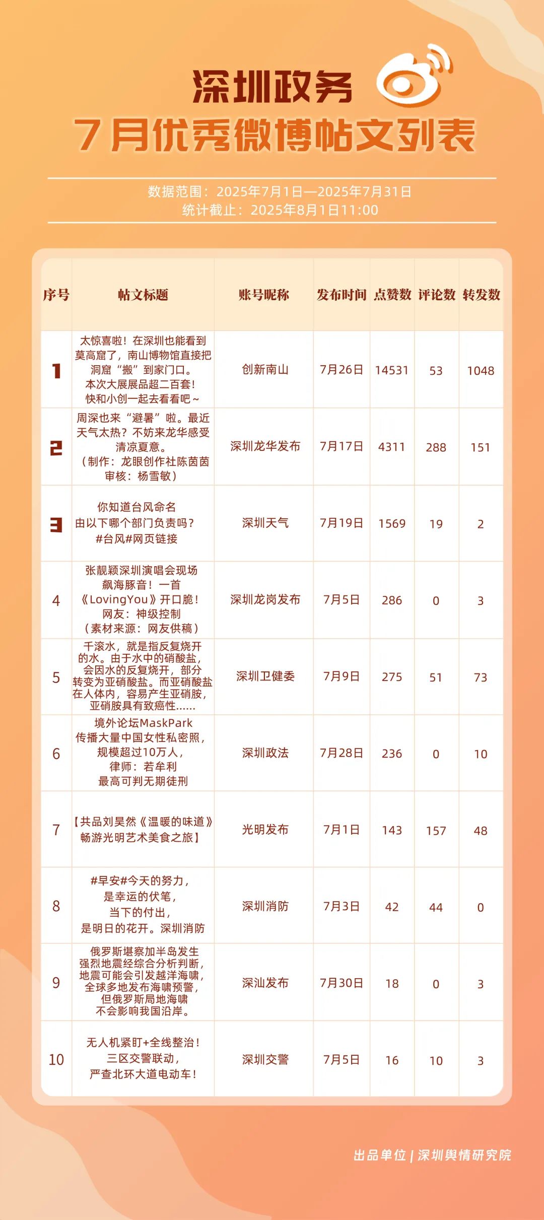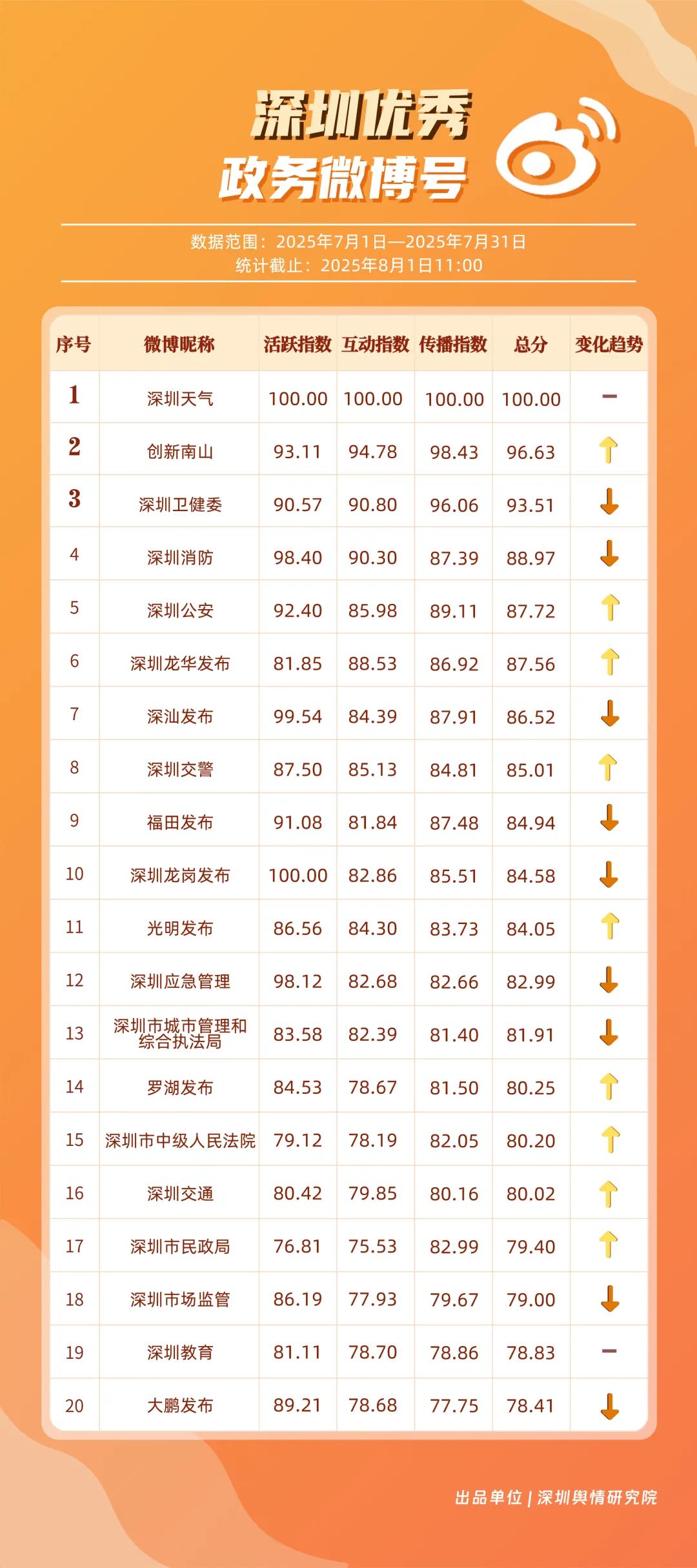 7月,“深圳天气”“创新南山”“深圳卫健委”“深圳消防”“深圳公安”“深圳龙华发布”“深汕发布”“深圳交警”“福田发布”“深圳龙岗发布”等20个账号入选“优秀政务微博号”。其中,“深圳天气”以活跃、互动、传播指数三项满分,蝉联榜首;“创新南山”以总分96.63跃居第二,排名呈上升趋势;“深圳卫健委”位列第三,评分也在90分以上,其科普信息持续获得市民广泛认可。以上优秀的政务微博账号精准贴合平台的传播规律,用独特的账号风格展现各自特色与魅力。