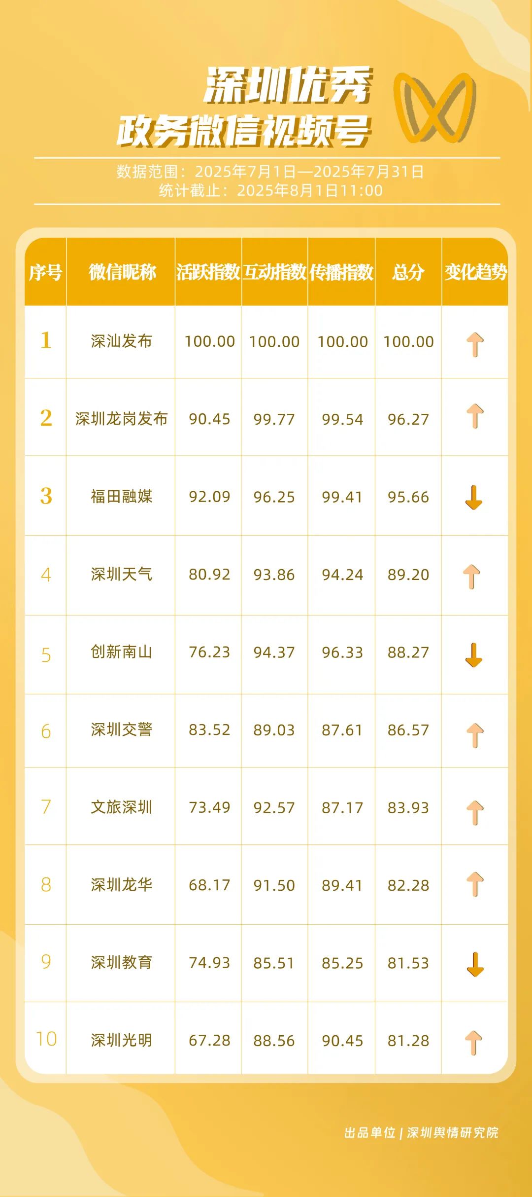 7月,获得“深圳优秀政务微信视频号”称号的是“深汕发布”“深圳龙岗发布”“福田融媒”“深圳天气”“创新南山”“深圳交警”“文旅深圳”“深圳龙华”“深圳教育”“深圳光明”。其中,“深汕发布”持续输出热点内容,收获大量网民关注、互动,三项指标均达满分,位居榜首;“深圳龙岗发布”“福田融媒”紧随其后,总分均超过95分,两账号通过多样化的内容呈现,在活跃、互动及传播等方面均有出色表现;“深圳天气”“创新南山”“深圳交警”等账号也获得不错成绩,总分均在85分以上。上榜微信视频号精准把握平台特性,高效传递了政务信息,更成为展现城市活力、拉近政府与民众距离的重要窗口。