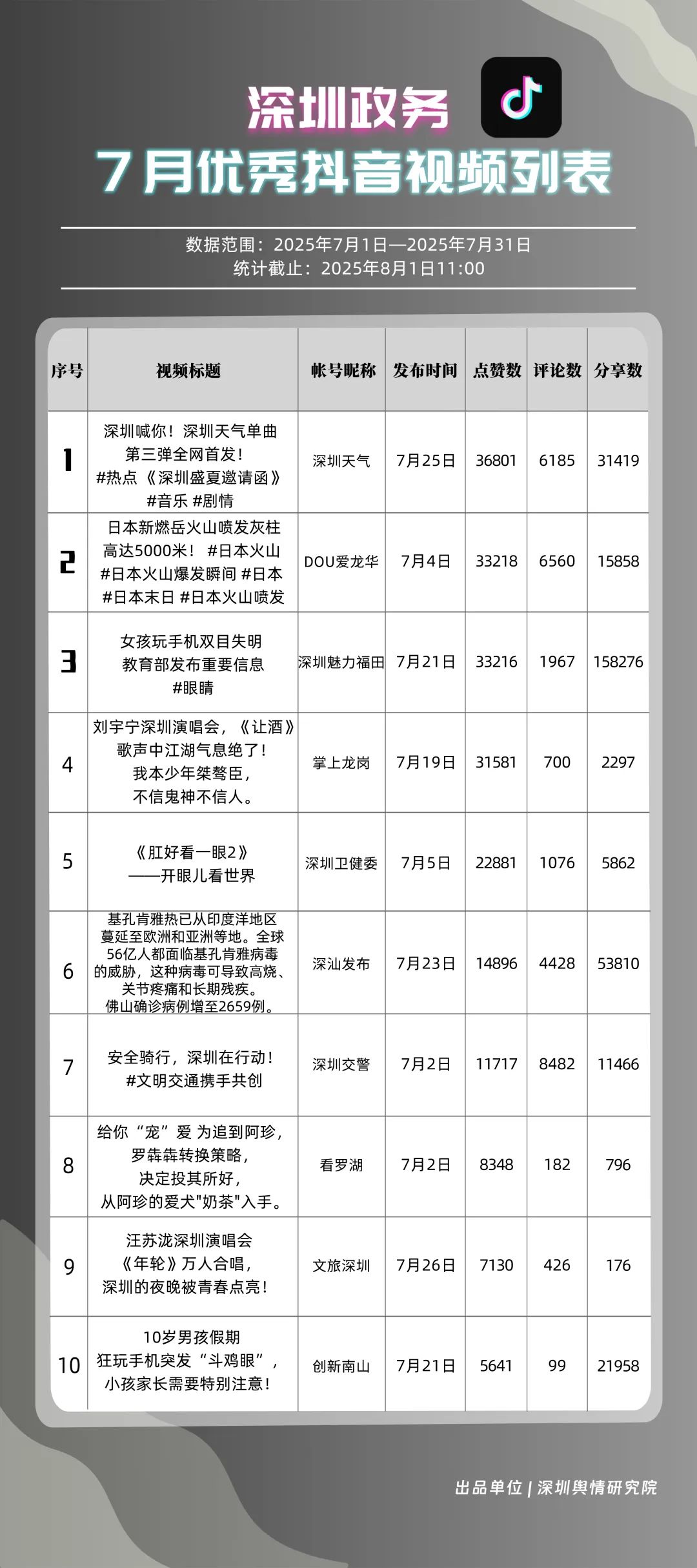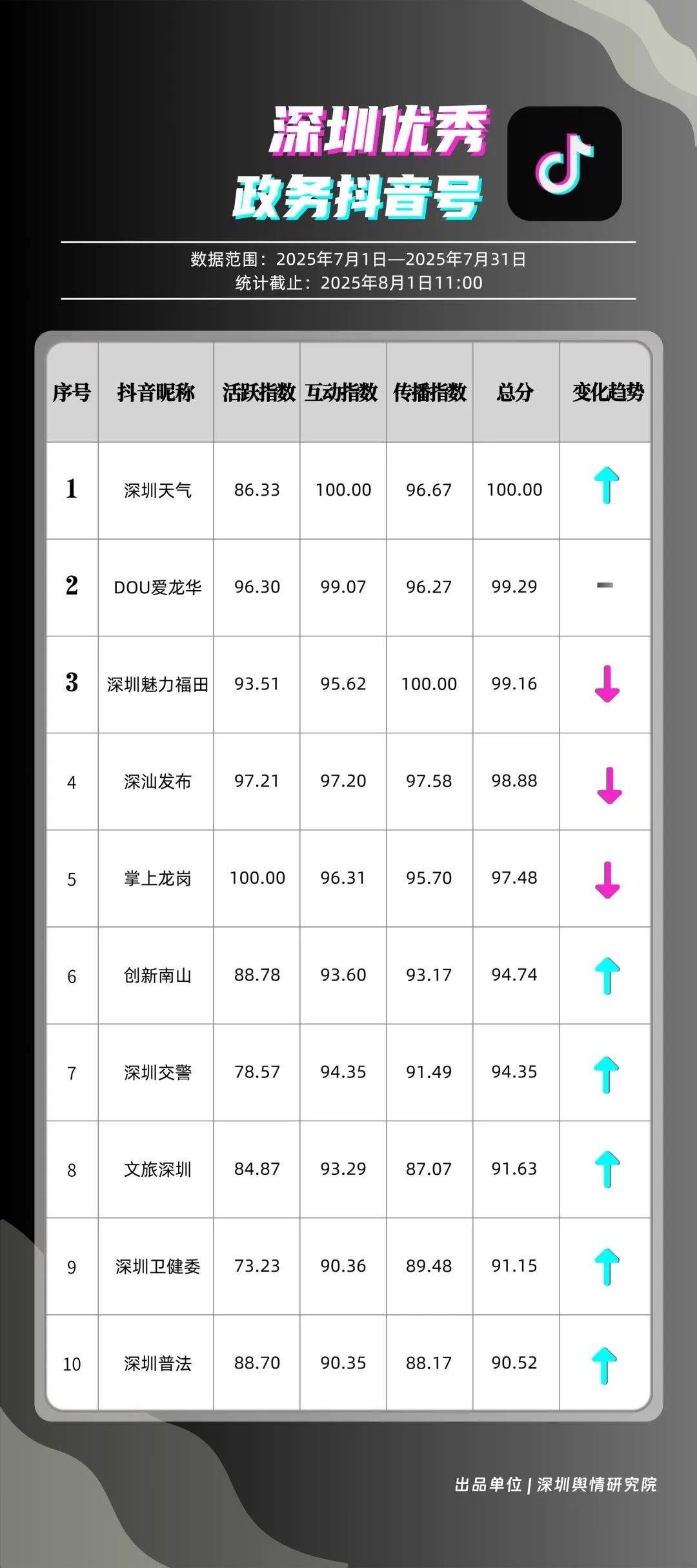 7月,“深圳天气”“DOU爱龙华”“深圳魅力福田”“深汕发布”“掌上龙岗”“创新南山”“深圳交警”“文旅深圳”“深圳卫健委”“深圳普法”共10个政务抖音号获得“优秀政务抖音号”称号。其中,“深圳天气”互动指标获满分,凭借气象与趣味相结合的创新科普形式,领跑优秀政务抖音号;“DOU爱龙华”“深圳魅力福田”分别位列第二、三名,通过聚焦网络热点、挖掘创意内容,不断提升传播效能,展现出强大的政务新媒体影响力;“深汕发布”“掌上龙岗”“创新南山”等账号紧随其后,上榜的优质政务抖音号用短视频语言强化传播效果,展现了鲜明的账号特色和风采。