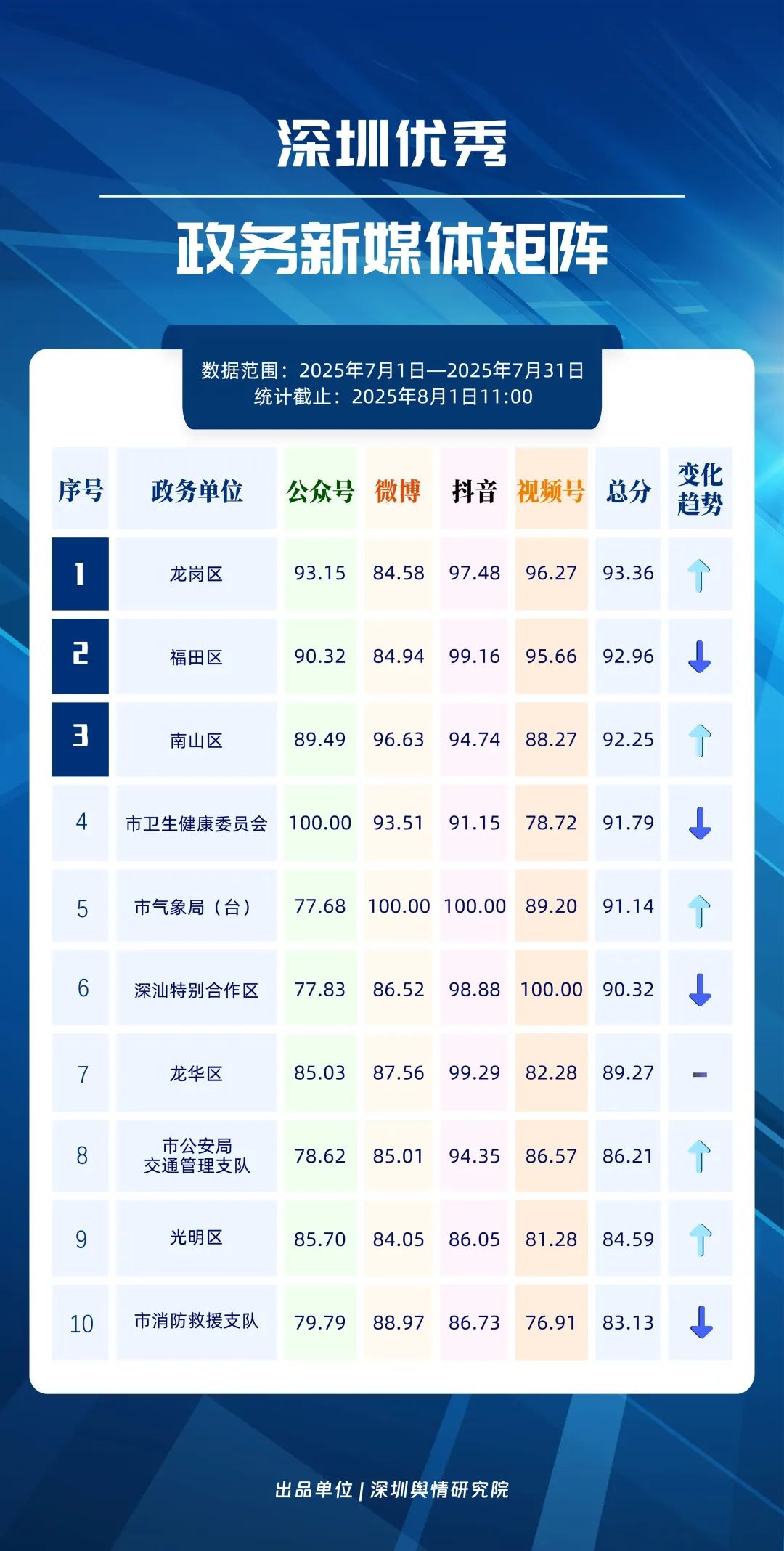 7月,深圳政务新媒体矩阵各展所长,为市民带来丰富实用的信息服务。龙岗区、福田区、南山区、市卫生健康委员会、市气象局(台)、深汕特别合作区、龙华区、市公安局交通管理支队、光明区、市消防救援支队的新媒体矩阵入选“深圳优秀政务新媒体矩阵”榜单。值得关注的是,龙岗区新媒体矩阵在7月着力提升内容质量,于抖音和微信视频号平台得分显著提高,成功登顶;福田区新媒体矩阵在抖音平台表现突出,位列榜单第二;南山区新媒体矩阵则在微博和抖音平台保持评分优势。此外,市气象局(台)、市公安局交通管理支队和光明区的排名也实现明显上升,体现出政务新媒体矩阵整体竞争力持续增强。