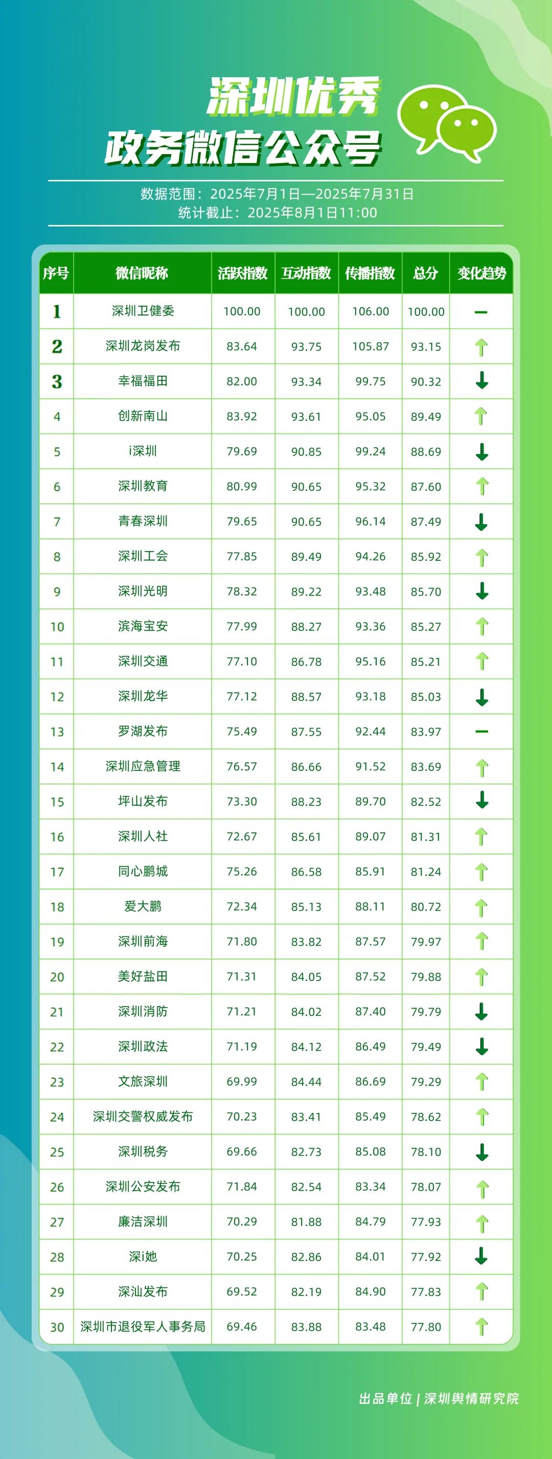 7月,30个政务微信公众号入选“深圳优秀政务微信公众号”榜单,其中包括“深圳卫健委”“深圳龙岗发布”“幸福福田”“创新南山”“i深圳”“深圳教育”“青春深圳”“深圳工会”“深圳光明”“滨海宝安”等。7月,“深圳卫健委”内容专业性与传播力优势稳固,整体表现保持较高水平,位于榜首;“深圳龙岗发布”聚焦民生服务与区域活动宣传,实现传播效果提升,位居第二;“幸福福田”表现同样不俗,排名第三。“创新南山”“深圳教育”“深圳工会”等也积极发布高质量信息与服务内容,能够较好平衡内容“质”与“量”,排名有所提升。上榜微信公众号依托特色优势深耕内容创作,将优质内容作为核心支撑,成为政务传播领域的优秀典范。