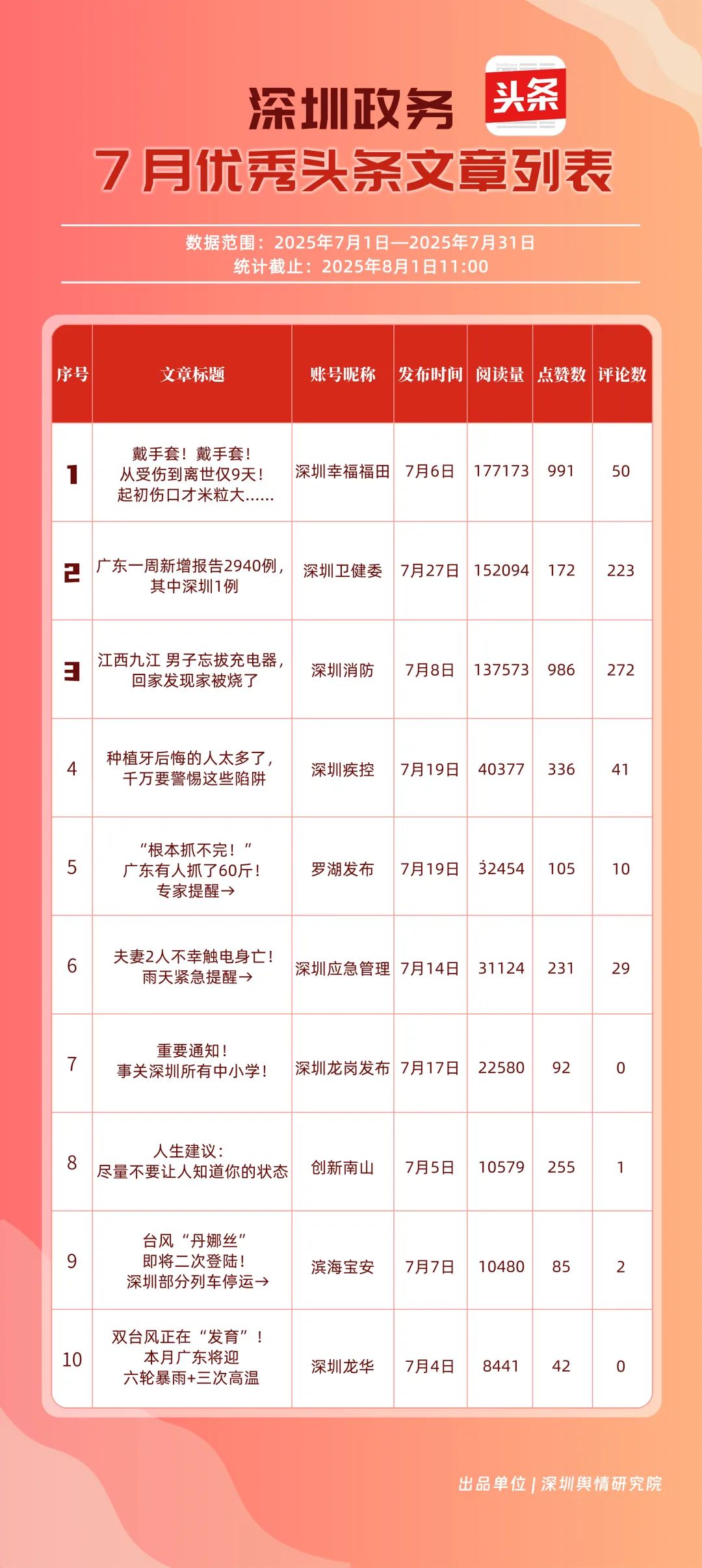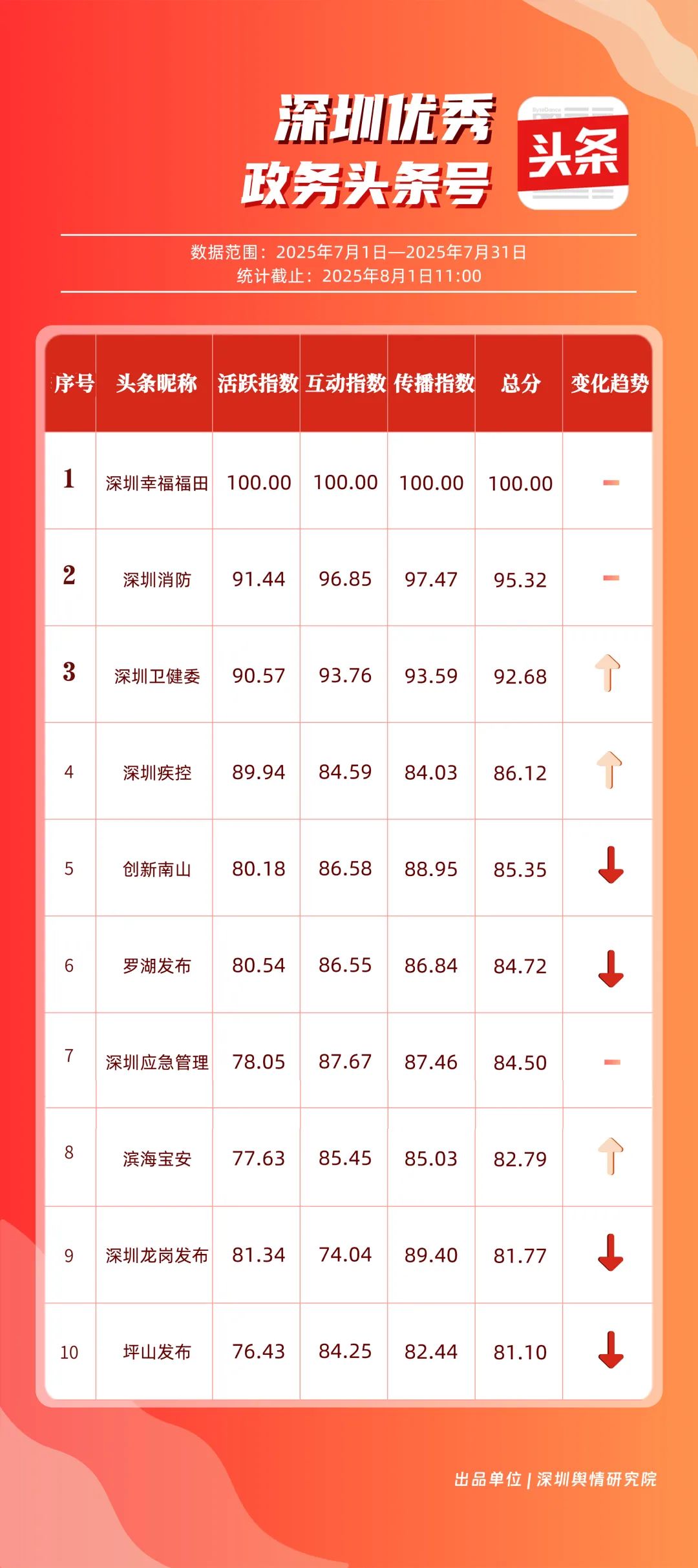 7月,“深圳幸福福田”“深圳消防”“深圳卫健委”“深圳疾控”“创新南山”“罗湖发布”“深圳应急管理”“滨海宝安”“深圳龙岗发布”“坪山发布”共10个政务头条号入选“优秀政务头条号”榜单。“深圳幸福福田”“深圳消防”凭借优质内容持续吸引用户关注,稳居前二;“深圳卫健委”表现亮眼,评分达92.68分,排名较6月有所上升;“深圳疾控”同样进步明显,在疾病预防控制信息传播上发挥了重要作用。“创新南山”“罗湖发布”“深圳应急管理”等上榜账号,也各展所长,始终将优质内容作为核心抓手,成为政务新媒体领域内容创作与传播的典范。