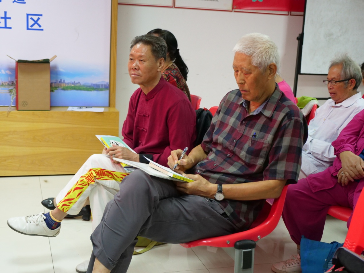 活动现场,珠光社区的叔叔阿姨们坐得整整齐齐,人手一本《深圳市民公约》册子和《汉字与修身智慧》学习资料,认真地翻阅着。