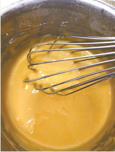 将蛋黄加入拌好的面糊里,拌均匀成蛋黄糊。