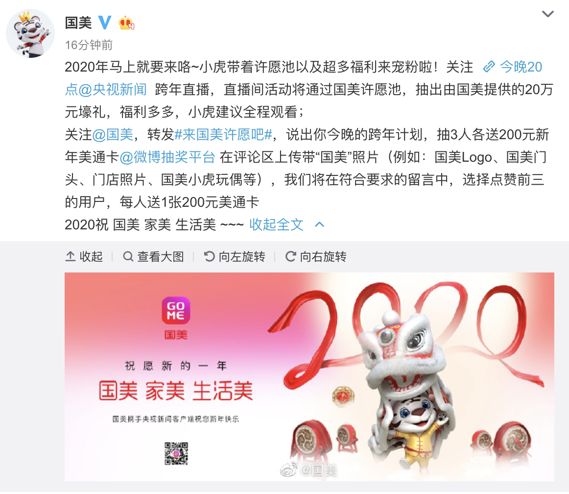 跨年就是要大声说出你的心愿,赶快@国美帮你圆梦。活动当天,国美官方微博将与央视新闻同步抽奖,2019年12月31日17点起至2020年1月1日不同时间段抽取多项大奖,其中最高奖项为价值2020元国美美通卡1张。