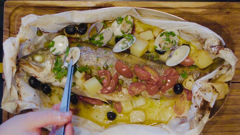 清蒸鲈鱼是常见的粤式吃法,本期,四季酒店主厨毕柏克为吃货们带来别样的鲈鱼吃法——“烤纸包鲈鱼”。他将鱼进行腌制后,用烘焙用纸裹紧,在烤炉中烤制40分钟。吸收了海鲜文蛤、白葡萄酒精华的鱼肉紧实鲜嫩,在打开外包纸的那一刻,香气四溢,让人欲罢不能。如此烹法,也能最大限度保存鱼的营养和鲜美。