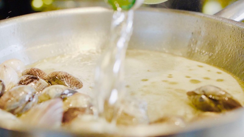 6、在平底锅中加入适量橄榄油,一边翻炒大蒜瓣和文蛤,一边加入白葡萄酒。待文蛤开壳后,加入柠檬汁以及欧芹,继续烹煮。待熟后,捞起备用;