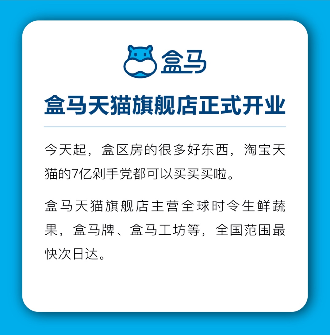 4月21日,盒马鲜生天猫旗舰店正式亮相。这是2020年盒马的重要生态布局之一。淘宝、天猫的7亿消费者,也可以享受到盒马全球时令的生鲜蔬果,以及盒马牌、盒马工坊等头部优质商品,将安全、鲜美的地方农货特产,端上百姓餐桌。