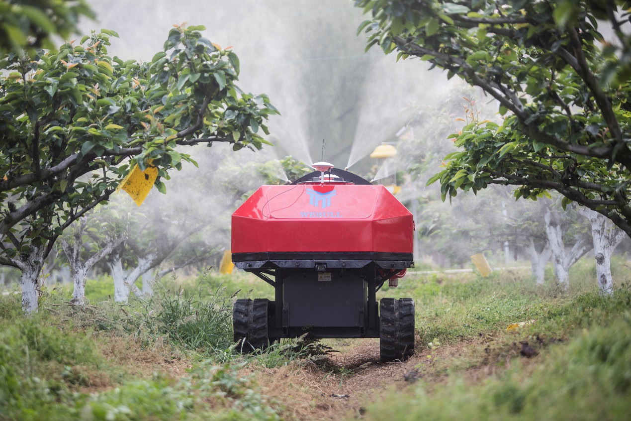 (翠冠梨数字农业基地的无人值守果园机器人正在田间施药,农民可远程操控)