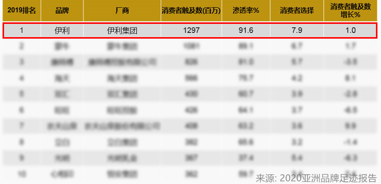 伊利连续五年位列中国市场消费者选择最多的品牌榜首