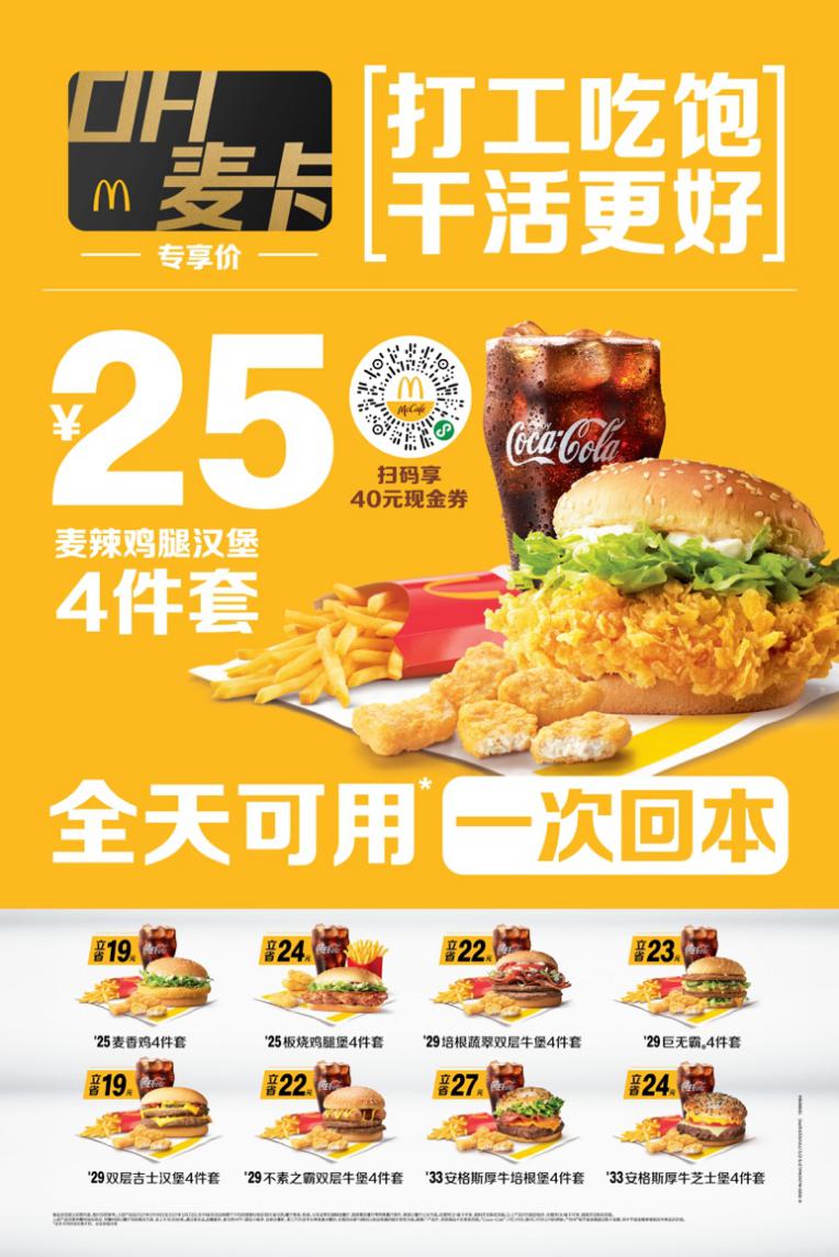 • OH麦卡全新升级:调查发现67%的打工人愿意付费来获得更大优惠。麦当劳OH麦卡职场卡升级多项权益,为打工人带来25元招牌产品四件套、早餐麦满分三件套6折、麦乐送免外送费及代金券等多种优惠。OH麦卡的权限覆盖打工人生活中的多个场景,在到店取餐、麦乐送、麦咖啡等多个渠道都可以全天使用。