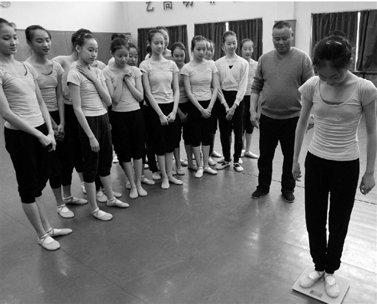 2月21日,记者来到浙江艺术职业学院舞蹈系,看着那个骨瘦如柴的女孩子轻盈地跳上体重秤,显示是43.6公斤。“天啦,超重了超重了,要跑10圈了!”她说。