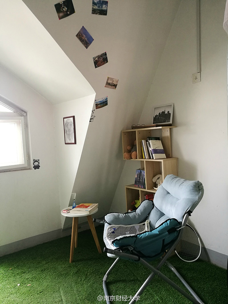 绵绵的草坪、充满设计感的书架、挂着素描画的墙……难以想象这是四个19岁男生的寝室。南京财经大学西苑9幢男生宿舍顶楼602寝室,住着4位“世外高人”—— 涂贵平、柯毅、刘以康和廉镇宇,他们用事实告诉大家,男生宿舍文艺起来,可丝毫不输女生。