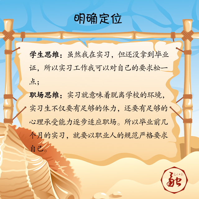 职场思维:实习就意味着脱离学校的环境,实习生不仅要有足够的体力,还要有足够的心理承受能力逐步适应职场。毕业前几个月的实习,就要以职业人的规范严格要求自己。