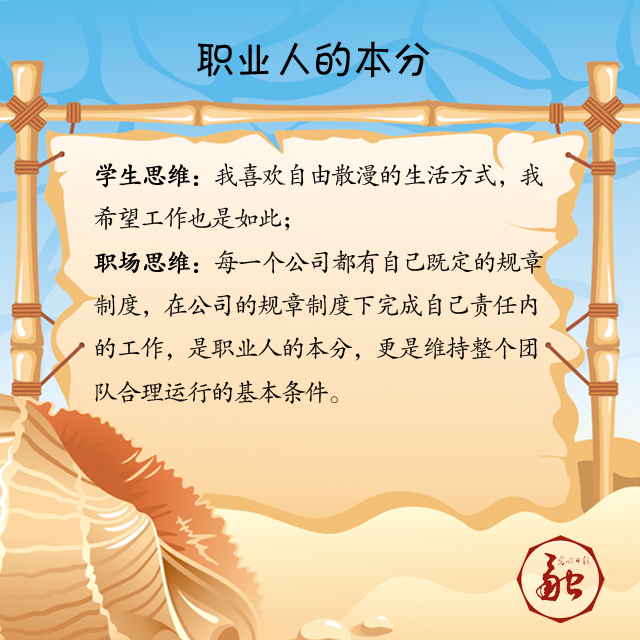 职场思维:每一个公司都有自己既定的规章制度,在公司的规章制度下完成自己责任内的工作,是职业人的本分,更是维持整个团队合理运行的基本条件。