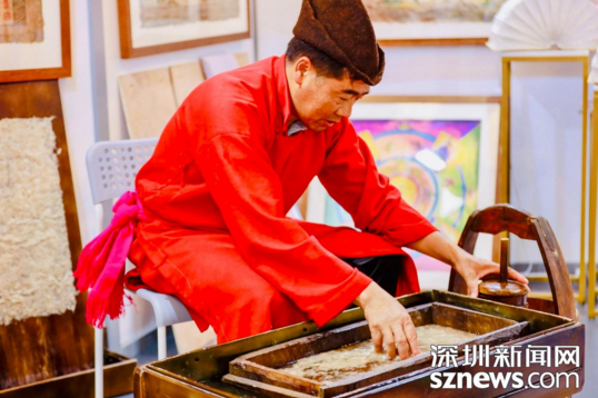 塔城东巴造纸第七代传承人李学高在现场持续“敲、打、洗、晾”的一系列工序,演绎东巴造纸的精湛工艺。东巴纸被称为“活化石”,是采用纳西地区稀有植物的树皮制作而成,这些“千年不腐”的东巴纸不仅可用于书写,添加花瓣、树枝后的东巴纸灯用作装饰也非常好看。