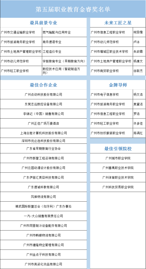 “未来工匠之星”柯异霈来自广州市信息工程职业学校,他勤勉上进,思维灵活、应变能力强,曾在省、市技能大赛网络空间空间安全赛项中屡获奖项;广州市轻工职业学校数控技术应用(智能制造方向)专业培养出一批批高端制造企业所亟需的技能人才,“三二分段”中高职对口专业更是为学生筑梦升学造就了“最具前景”平台……