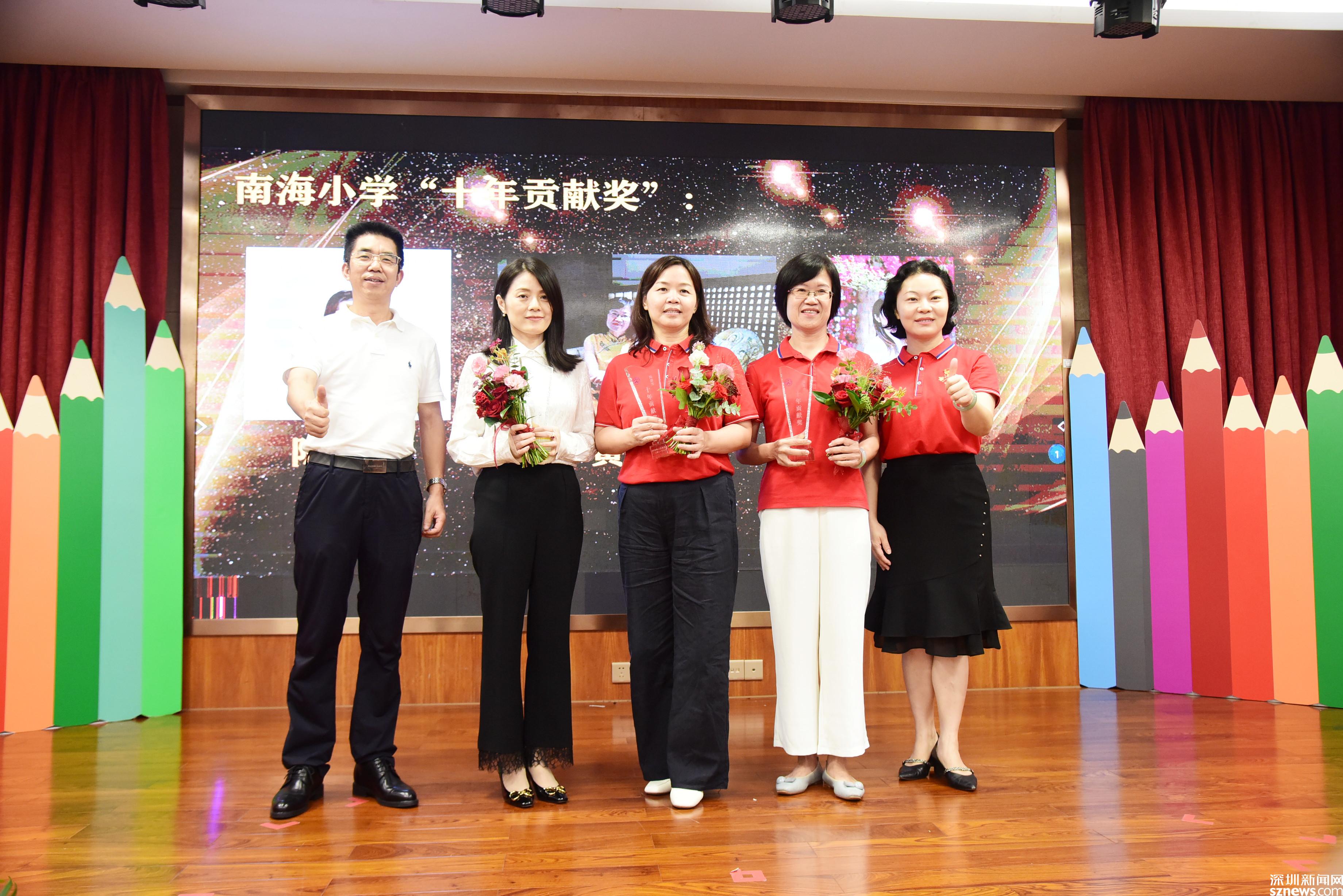大会颁发了南海小学“十年贡献奖”、南海小学特别贡献奖、教学质量奖,也对南山区优秀教师、南山区优秀班主任、入围南山区2021“年度教师”决赛教师等进行了表彰。入围南山区2021“年度教师”决赛的李艳老师、青年教师代表方子玉老师上台分享了她们的教育教学经验与成长心路历程,李艳老师说:“我不仅仅是一名英语教师,更是孩子们的梦想合伙人!”方子玉老师说:“南山就是一块永远充满学习热情的沃土,南海更是一所不断为青年教师搭建学习平台的宝藏学校。”