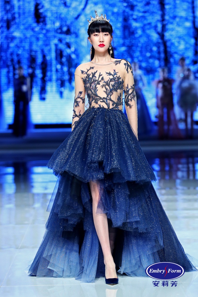 梅花在冬至盛开,肉粉色梅花刺绣与珠片蕾丝相辅相成,东方风情与西方浪漫的双重结合下,诠释新风貌女性的优雅、独立、愉悦与真我。晶莹剔透的冰花出现在小寒时节,犹如童话精灵,蓝白相间的丝绒面料和蕾丝拼接,宫廷般的华丽款式散发着耀眼的光芒,模特宛若冰雪世界的女王,贵气十足。大寒时节已是一片冰天雪地,晶莹的雾凇冰挂花纹在华丽的深蓝礼服上蔓延开来,曼妙的纱裙在摆动间如浩瀚星河坠入人间,冬日的奢华意境令人惊叹。