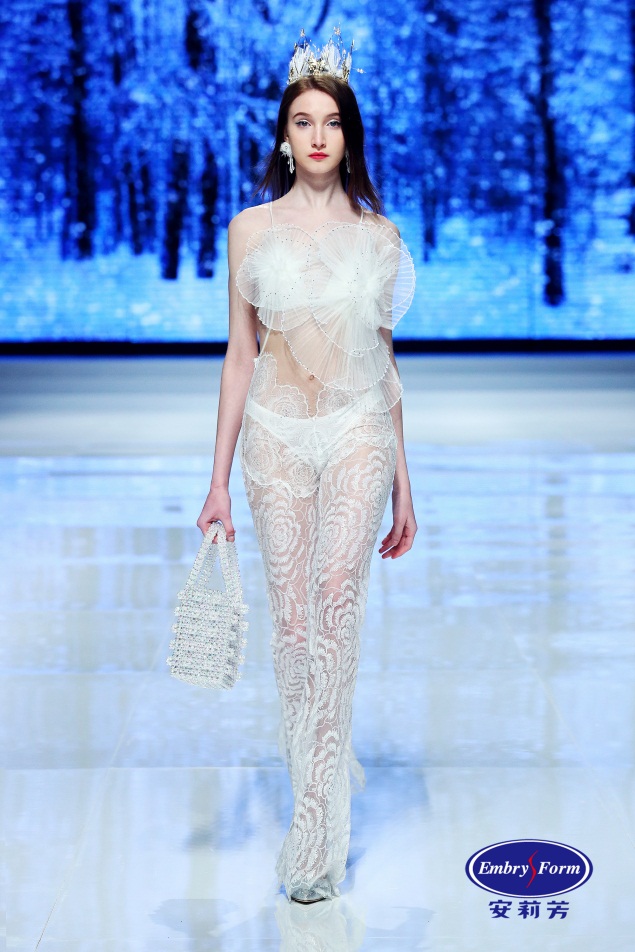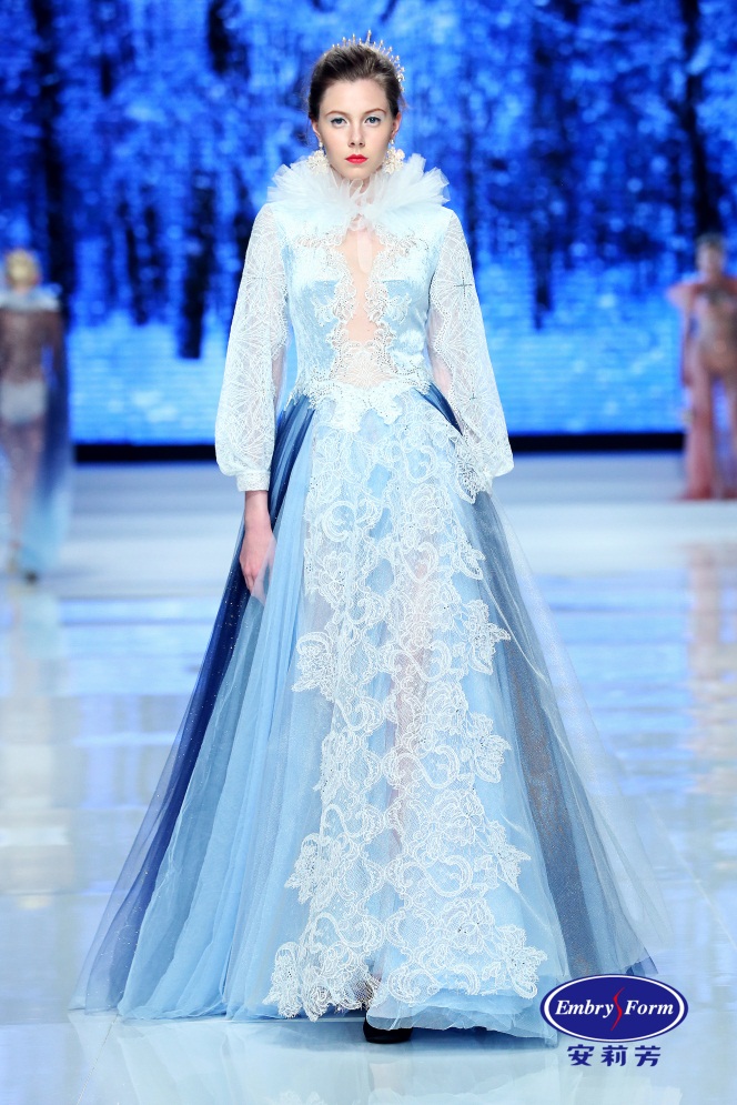 雪花晶莹剔透,漫天飞舞。自然四季的最后一站已经到达,一场冰雪世界的旅行在 T台上延展开来。 Liza Cheng这一季的礼服将细节肌理装饰与曼妙薄纱及性感蕾丝融合,闪