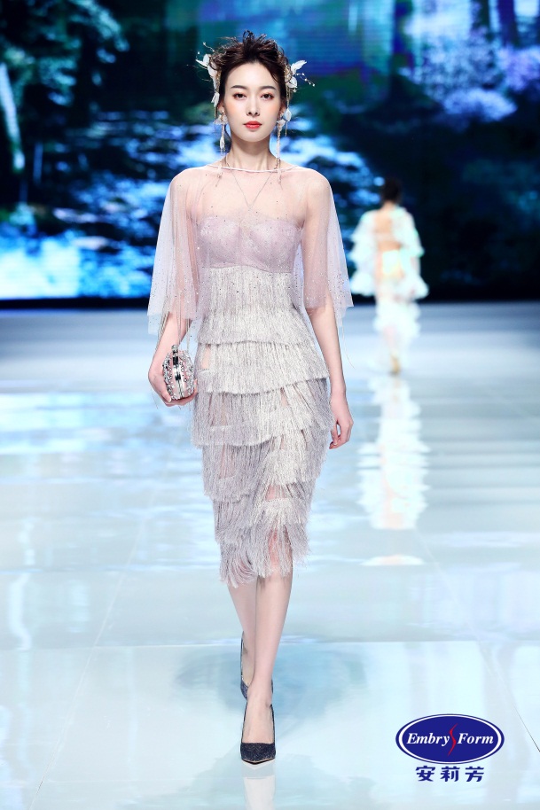 立春之初,空气中还夹杂着一丝尚未消逝的冬日清冷。婀娜优雅的鱼尾裙将模特装扮成了美人鱼,展露出窈窕的动人风姿。雨水是春天的变奏曲,金属丝流苏似春日里的朦胧雨线,温柔洒落在灰粉渐变的长裙上,梦幻又浪漫。惊蛰至,桃花开,细腻纱裙上恣意绽放着大片手工立体桃花,曼妙披肩及开叉长裙的舞动带来飘逸灵动的感觉,蓬勃春意扑面而来。