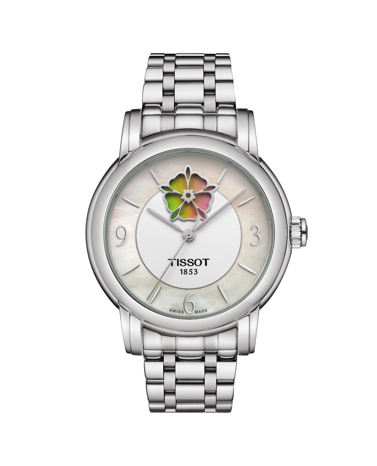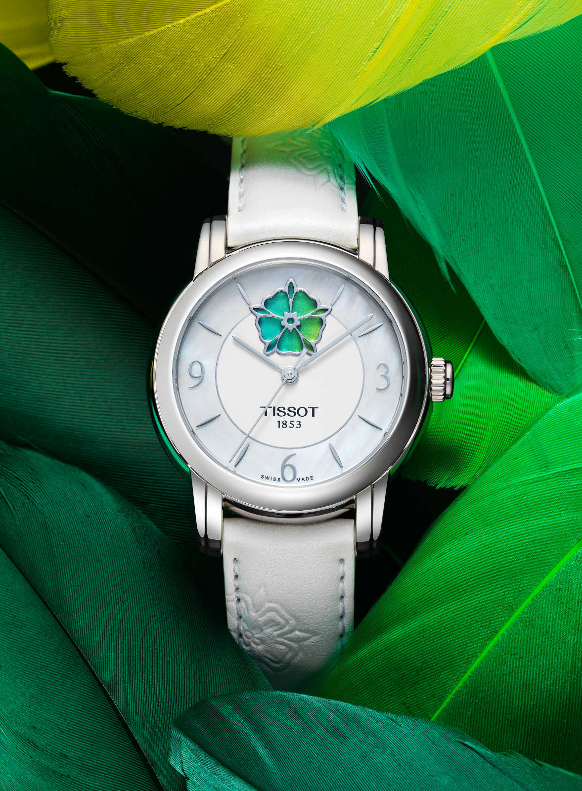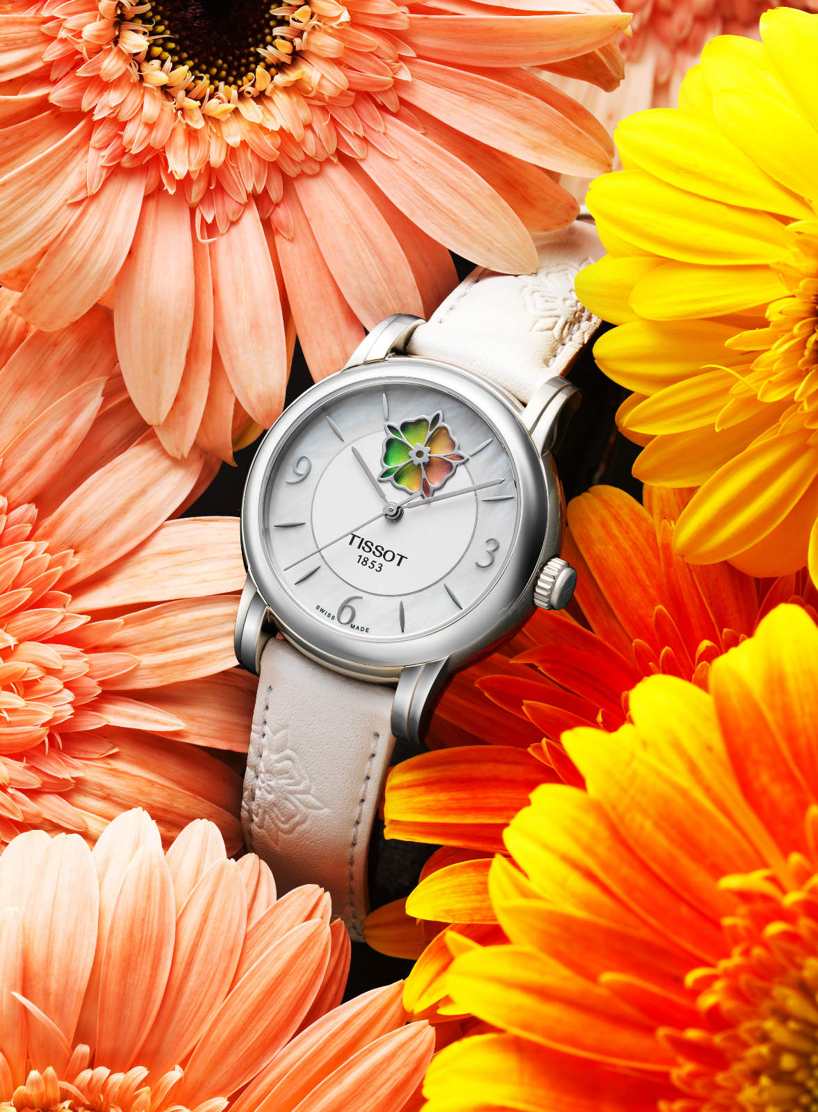 天梭心媛系列以雅致玲珑表盘间的彩虹玫瑰,叙述着夏季时节的斑斓心情,镂空玫瑰随时光流转渐次变换出梦幻色彩,尽展女性多面魅力。正如天梭家族徽章的释义:“芳香和力量与我同在,我华丽之彩永世不隐”,珍珠贝母材质表盘与绚丽的彩虹玫瑰相得益彰,繁简得当,衬托出万千柔美女性的恬静而笃定的内心。