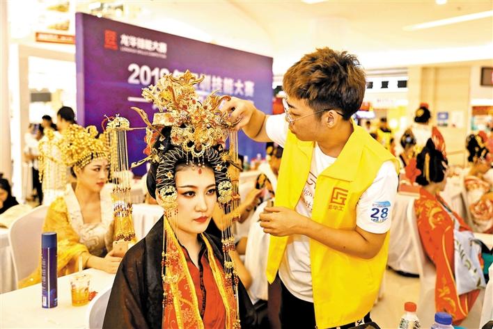 在当天的开幕式现场,同时举行了形象设计(美容)项目的决赛。44位决赛选手经过彩绘、实操及模特风采展示环节三轮比拼,最终决出了一二三等奖。本届形象设计(美容)决赛的主题是唐代贵妃装。记者在现场看到,44位经过形象设计装扮成唐代贵妃的模特,有的雍容华贵,有的端庄大方,有的秀艳可人,形态各异,各有特色,赢得现场观众的阵阵掌声。