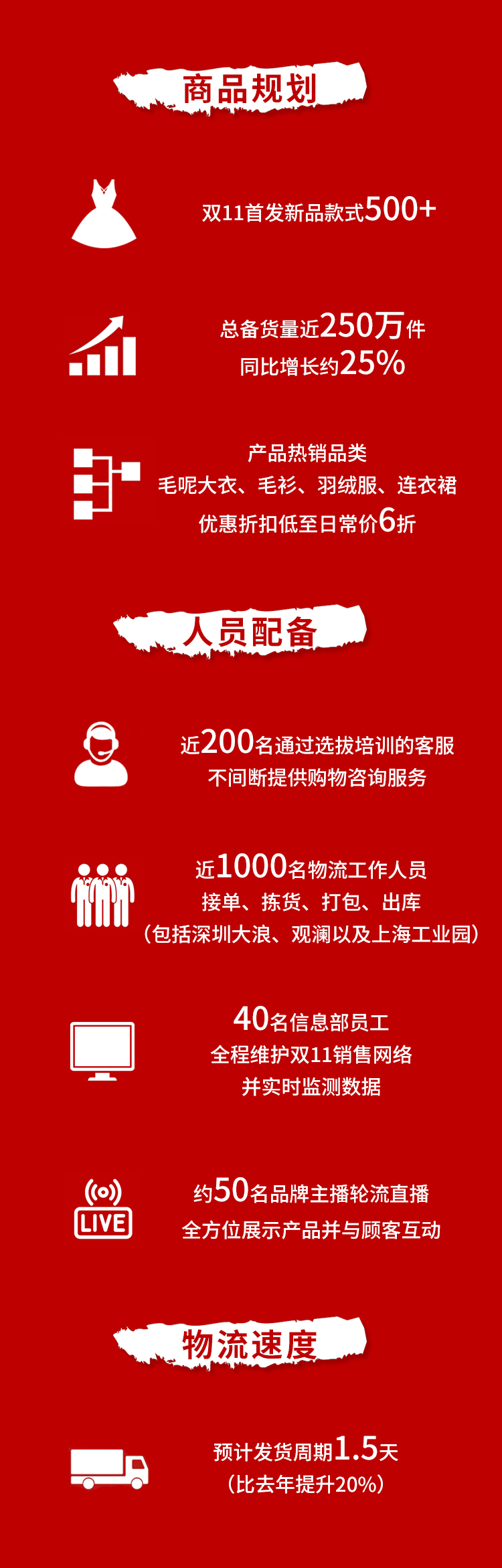 各品牌提前近半年采用大数据分析为双11宣传策略、货品策略提供数据支持;在商品规划上,精选畅销款,减少无效库存,通过研究潮流趋势,融合品牌元素,推出了500多款双11首发新品,总备货量比去年增长约25%。