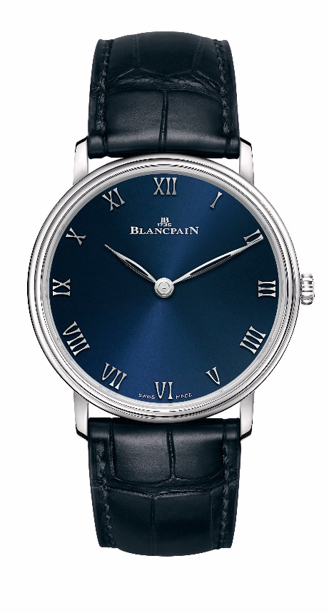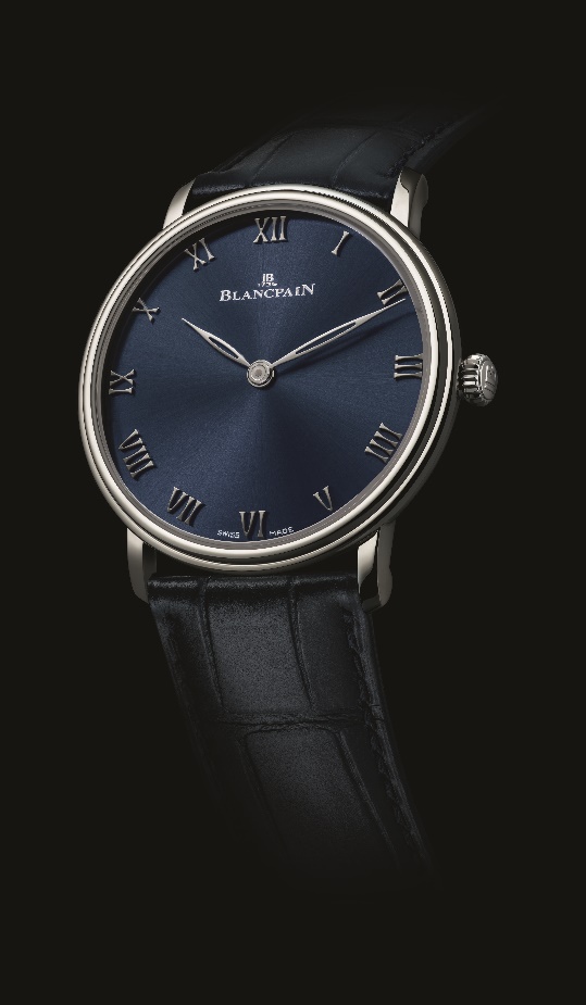 全新宝珀Villeret经典系列超薄腕表配备了直径40毫米、厚度仅为7.40毫米的超薄铂金表壳,搭配着优雅深邃的蓝色表盘、与之相得益彰的蓝色短吻鳄鱼皮表带及针扣。这一独家表款限量发行88枚,您可以在全球各地的宝珀精品店内品鉴选购。(吴艳)