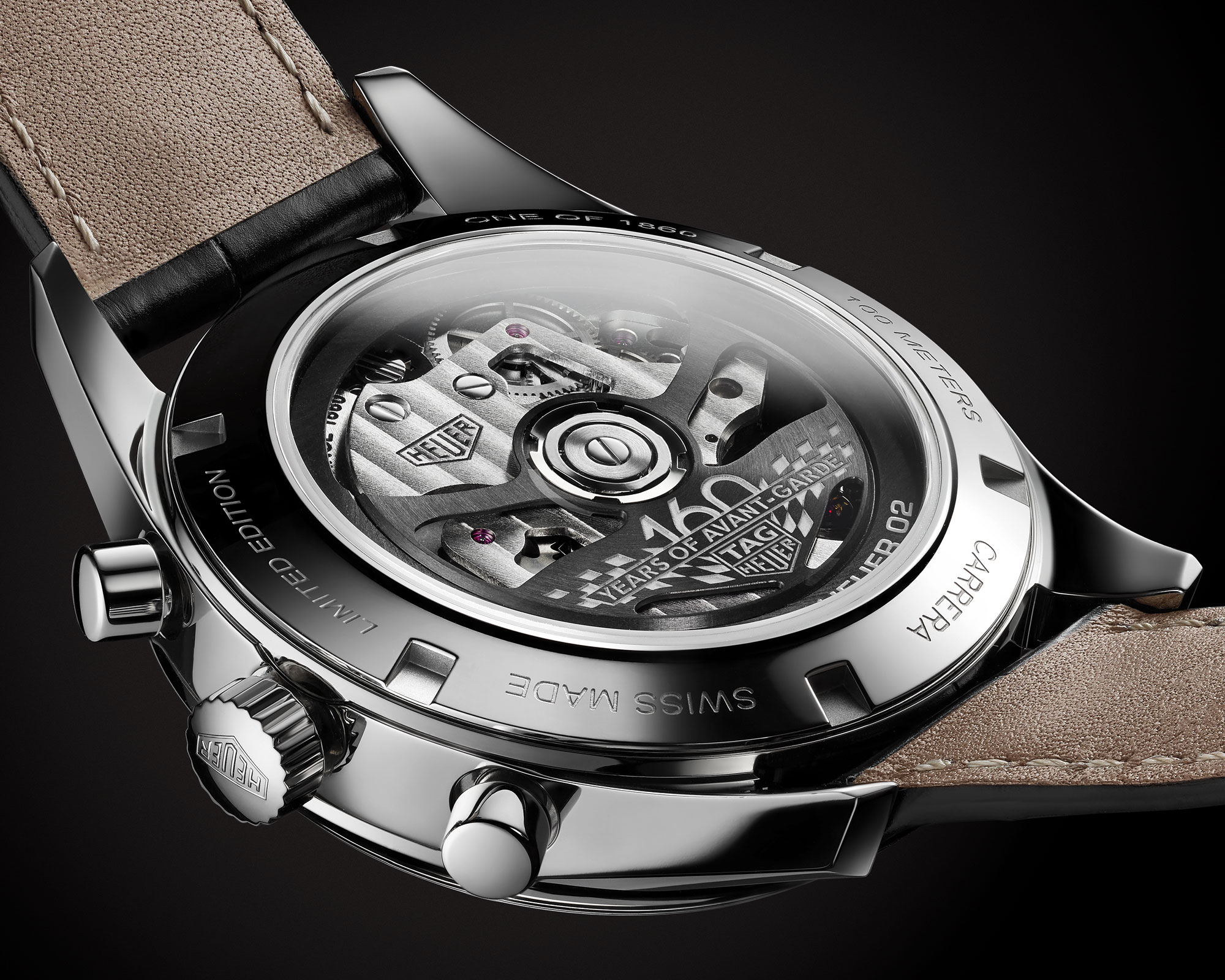 表款搭配黑色鳄鱼皮表带,限量生产1860枚——致敬豪雅的创立之年。同时,表底盖上镌刻有“One of1860”和“ LIMITED EDITION”字样。透过旋入式蓝宝石表镜,经过重新设计的摆陀一览无余。摆陀饰有漆面雕刻,彰显周年纪念版的与众不同。腕表同时以特别的包装呈现。