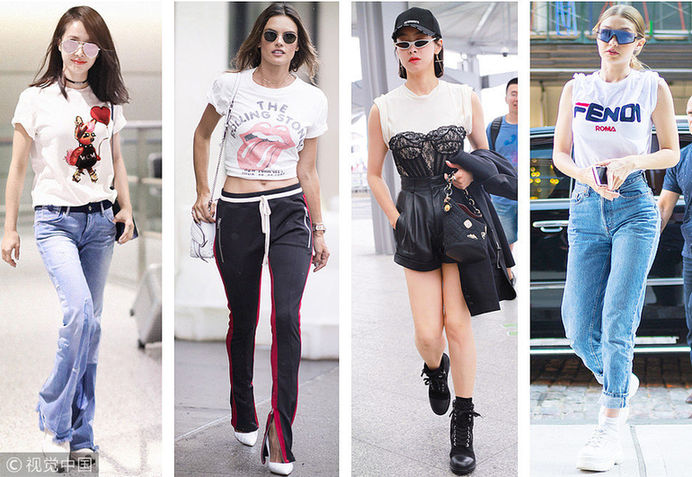 夏日炎炎怎么穿才最简约清爽?答案一定是T恤无疑了!只是一本正经的寻常穿法又怎么会是时髦精的所爱,宋茜、吉吉带头玩起挽袖新花样,大面积露玉臂,清凉又养眼!(图片来源:视觉中国)