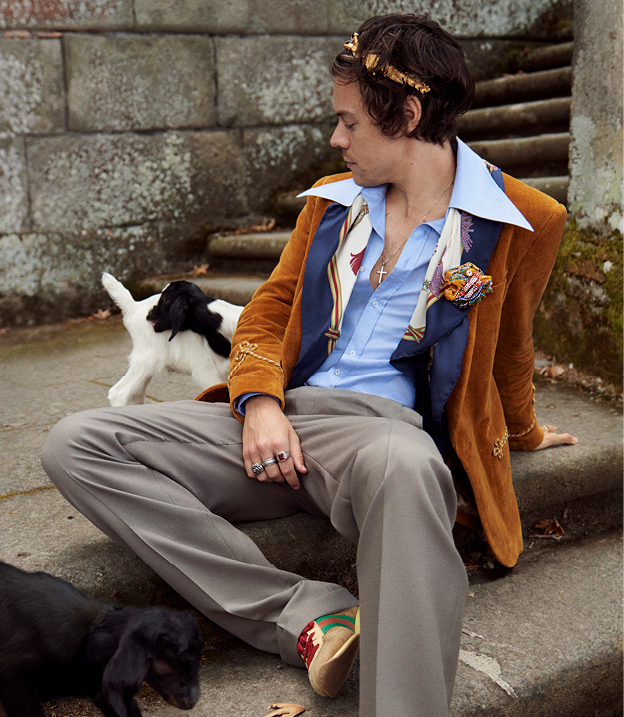 身处16世纪文艺复兴时期风格主义的意大利别墅花园,哈里·斯泰尔斯穿上全新都会男士正装系列,当中独特的图案、彩色提花、嵌花编织、贴饰,配合别具一格的裁剪比例,将古驰的当代美学展现得淋漓尽致。