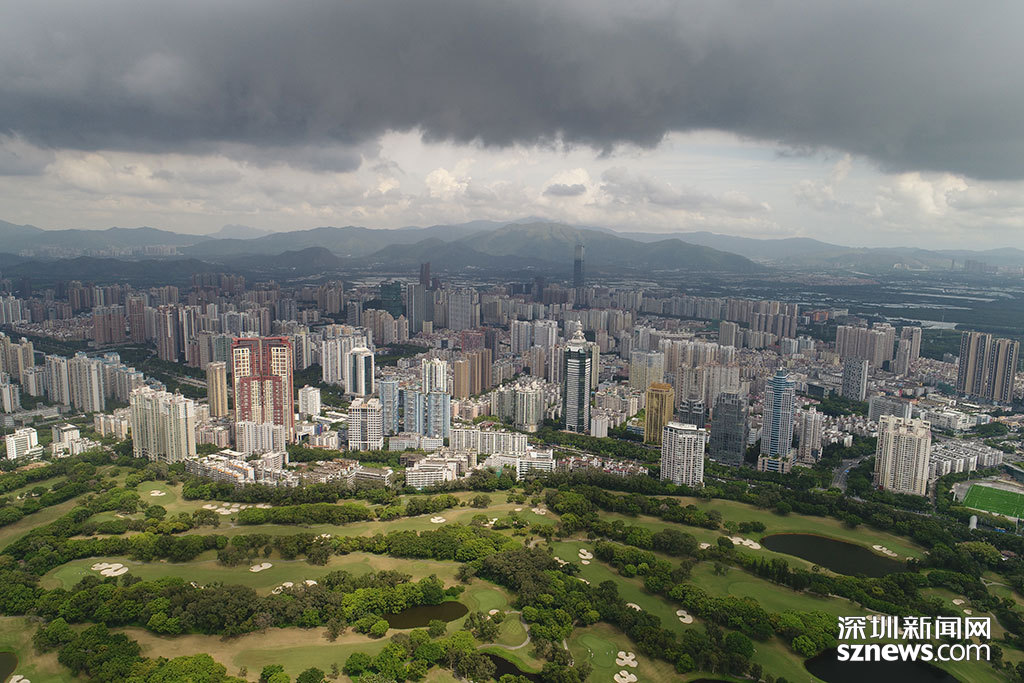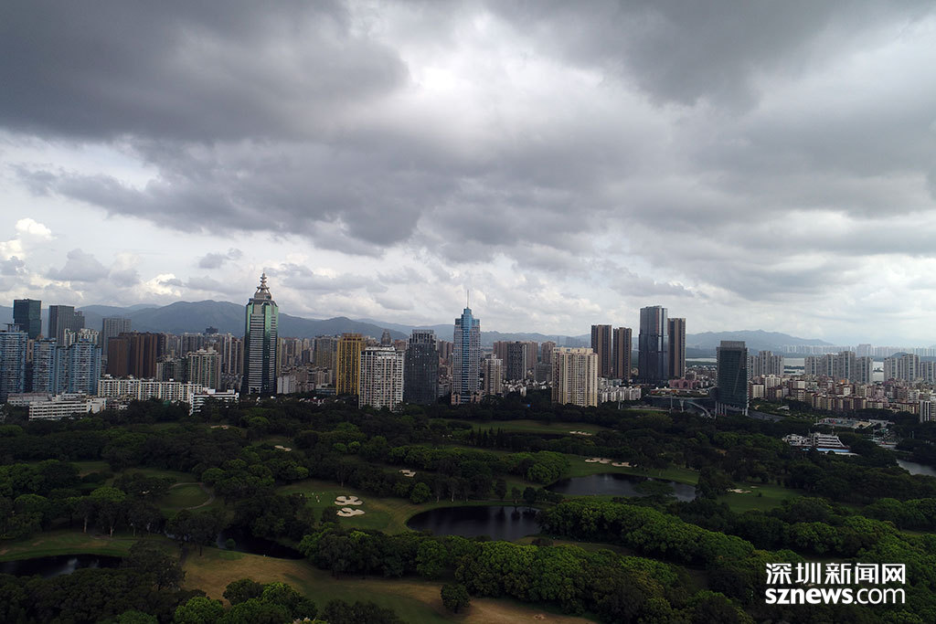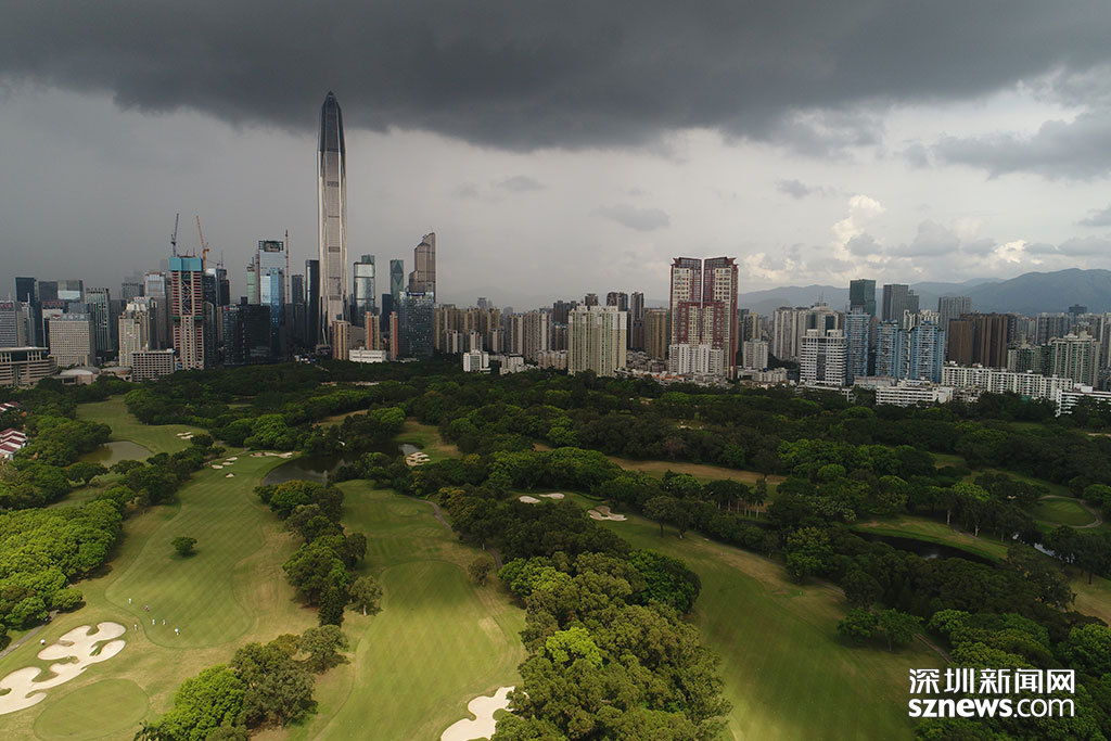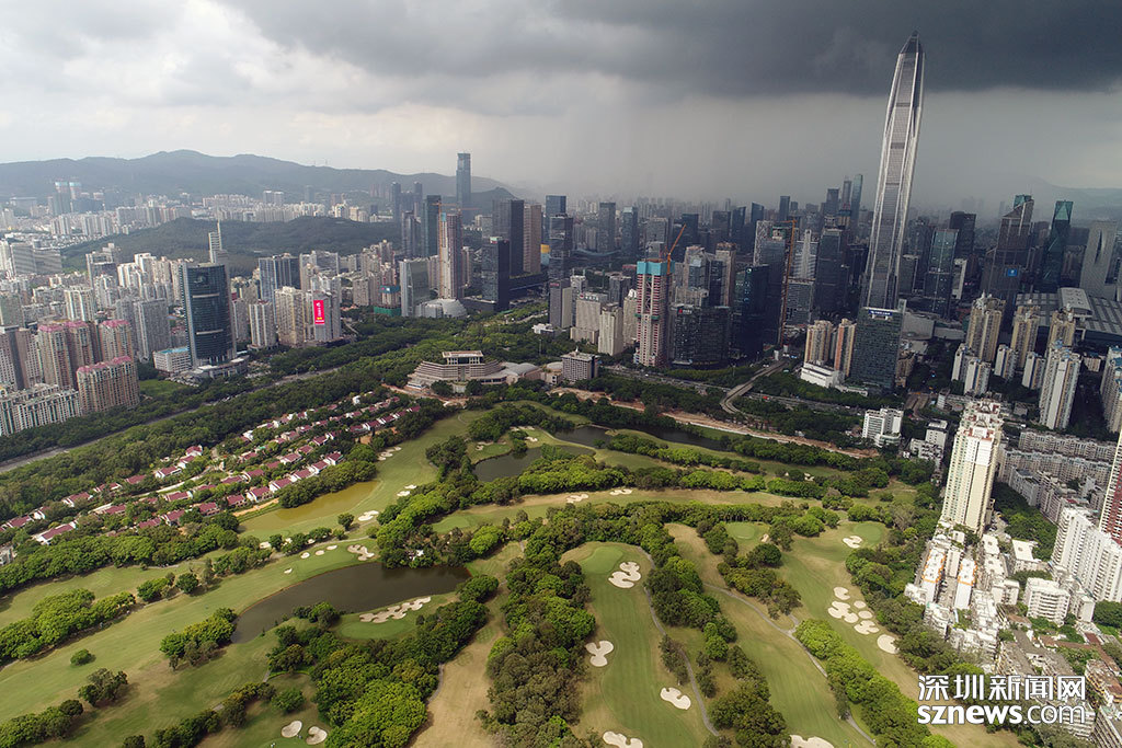 乌云笼罩下的平安大厦与深圳高尔夫俱乐部球场